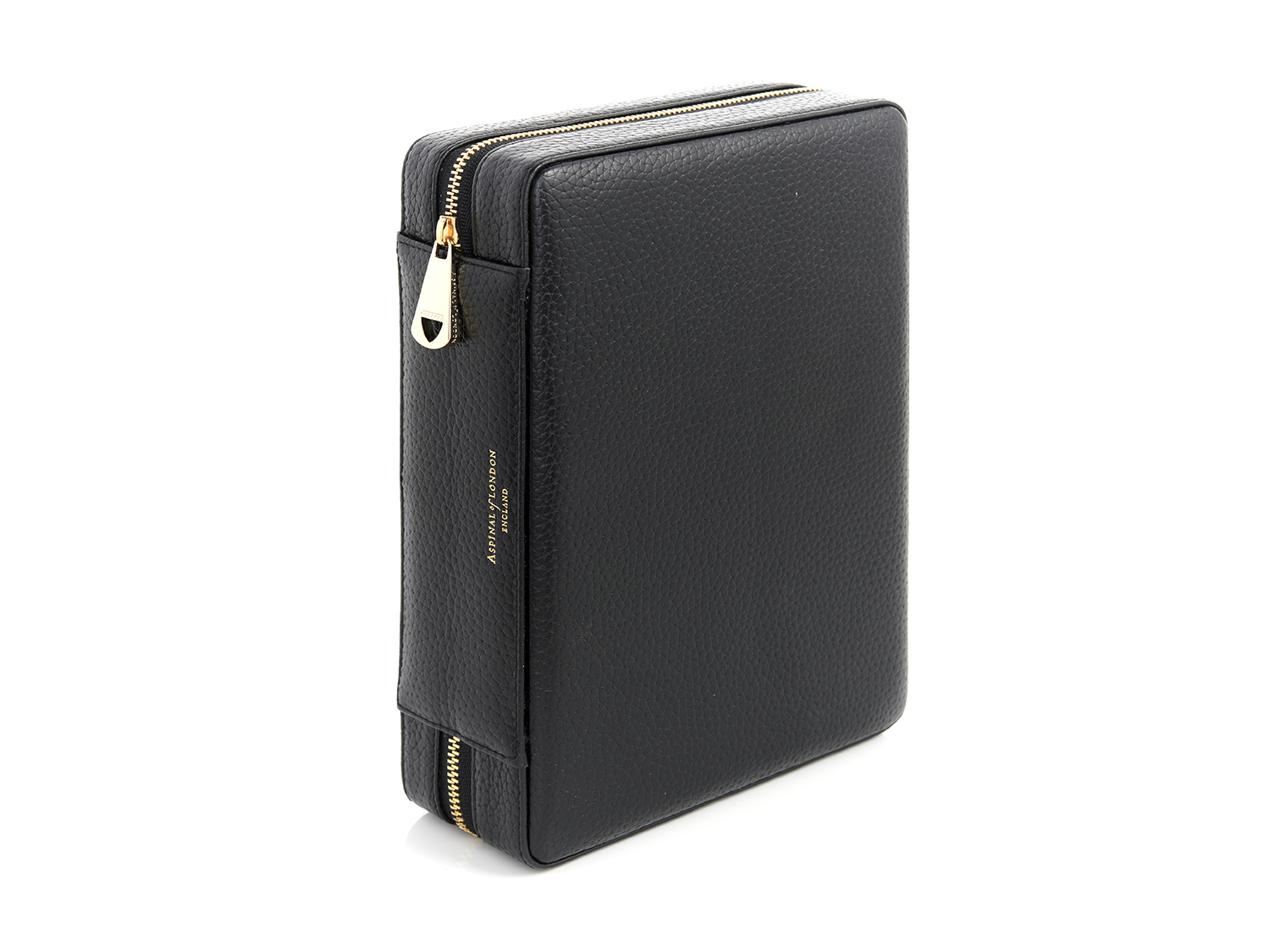 ASPINAL OF LONDON, A GRAINED LEATHER JEWELLERY TRAVEL CASE WITH GOLD TONE METAL HARDWARE, 22 x 16 x 6cm.