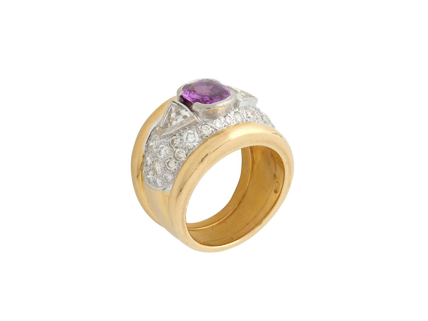 The wide band centring a semi-bezel set oval-cut pink sapphire weighing approximately 1.40 carats, flanked by bezel-set trilliant-cut diamonds within a pavé-set diamond surround, the diamonds together weighing approximately 1.50 carats, size M-N.