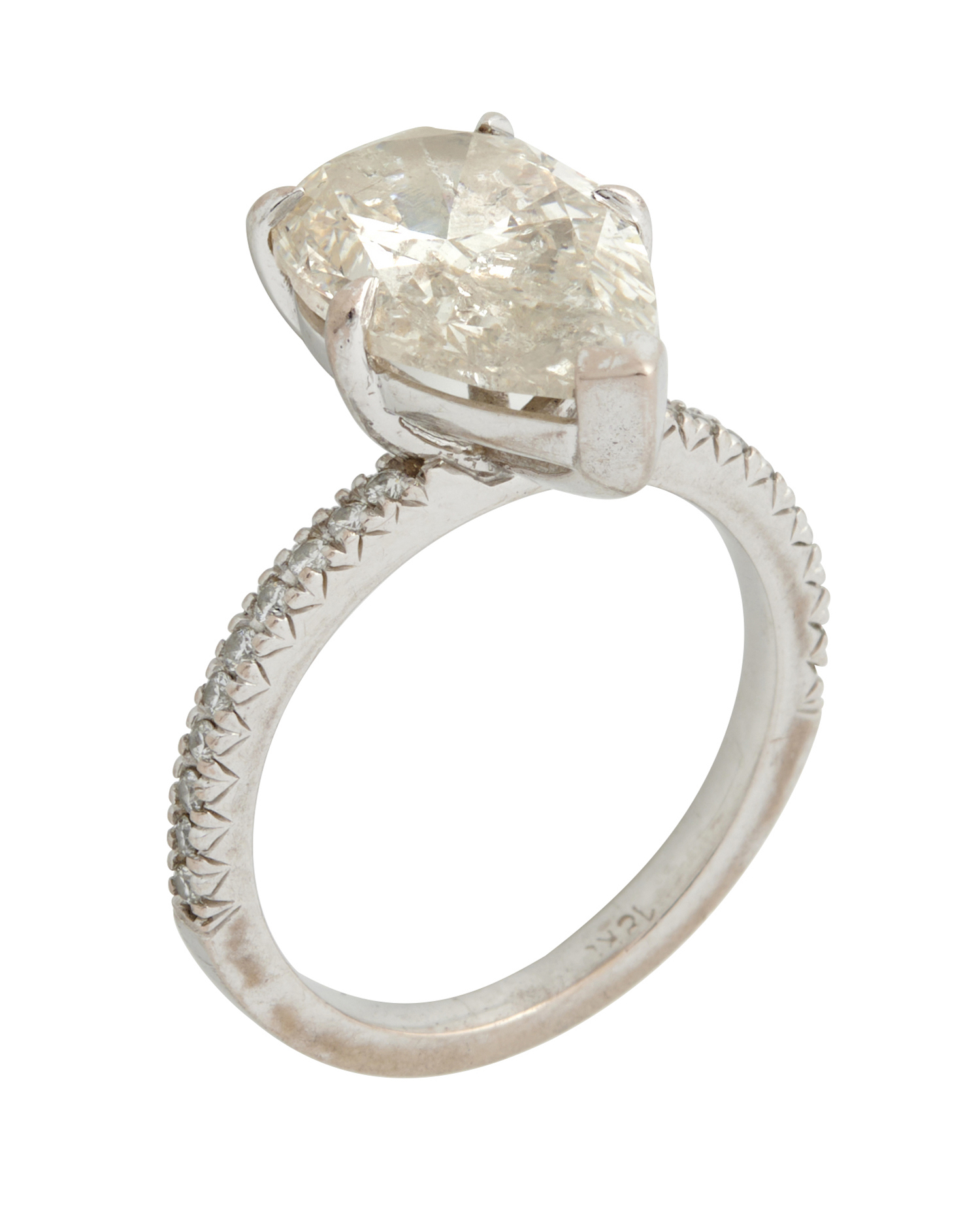 A DIAMOND RING IN 18CT, CLAW-SET WITH A PEAR-CUT DIAMOND WEIGHING 4.00 CARATS, TO SHOULDERS SET WITH BRILLIANT-CUT DIAMONDS TOGETHER WEIGHING APPROXIMATELY 0.14 CARATS, SIZE K, ACCOMPANIED BY AN IGI DIAMOND REPORT NUMBER 270756698 DATED 7TH JUNE 2017 STATING THE 4.00 CARAT DIAMOND IS K COLOUR, I2 CLARITY