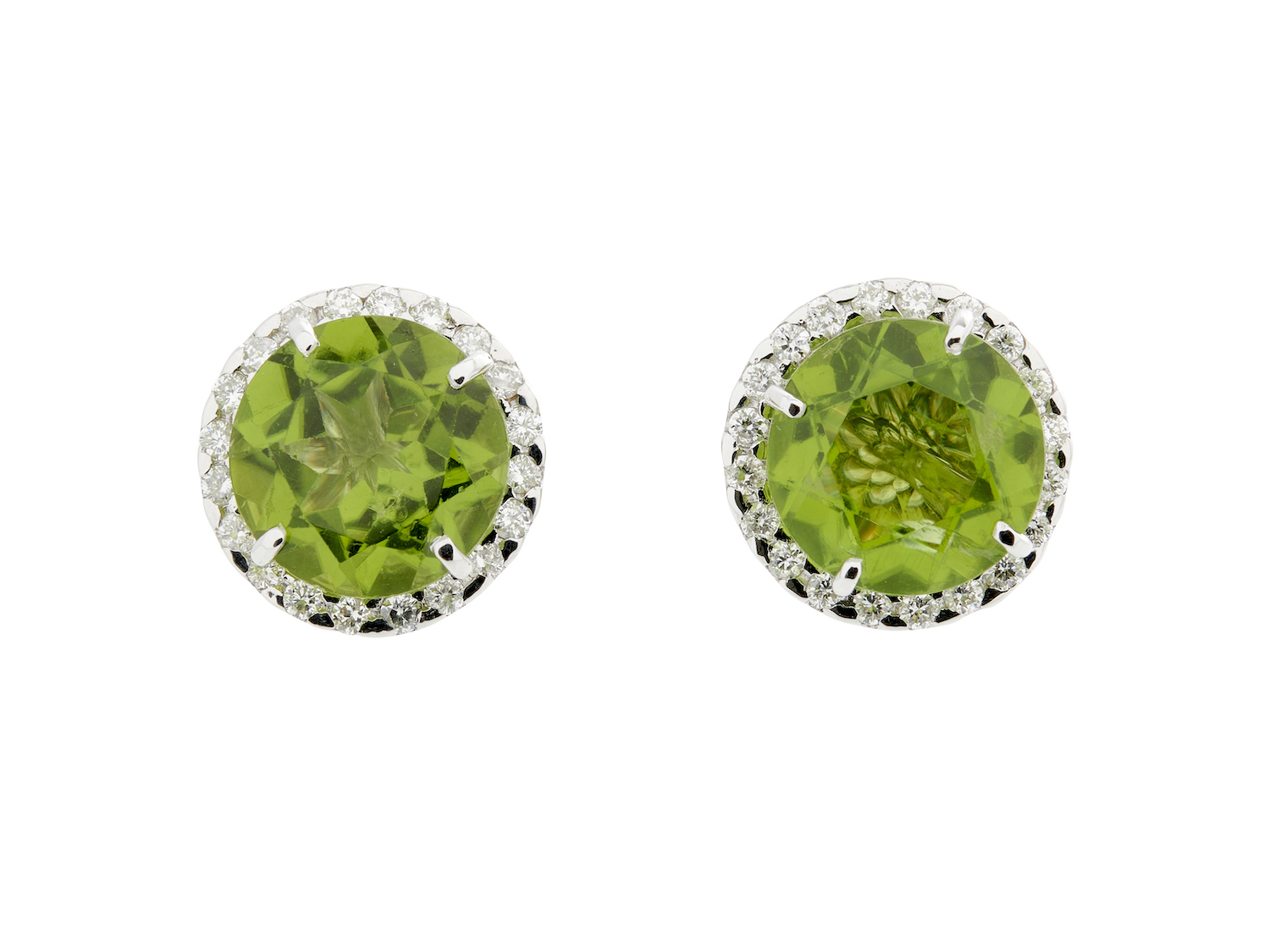 Each earring of convertible cluster design, centring a claw-set circular-cut peridot within a detachable surround of claw-set brilliant-cut diamonds, with interchangeable claw-set circular-cut black diamond centre, the peridots together weighing approximately 11.50 carats, the black diamonds together weighing approximately 11.33 carats and the diamonds together weighing approximately 0.28 carats,