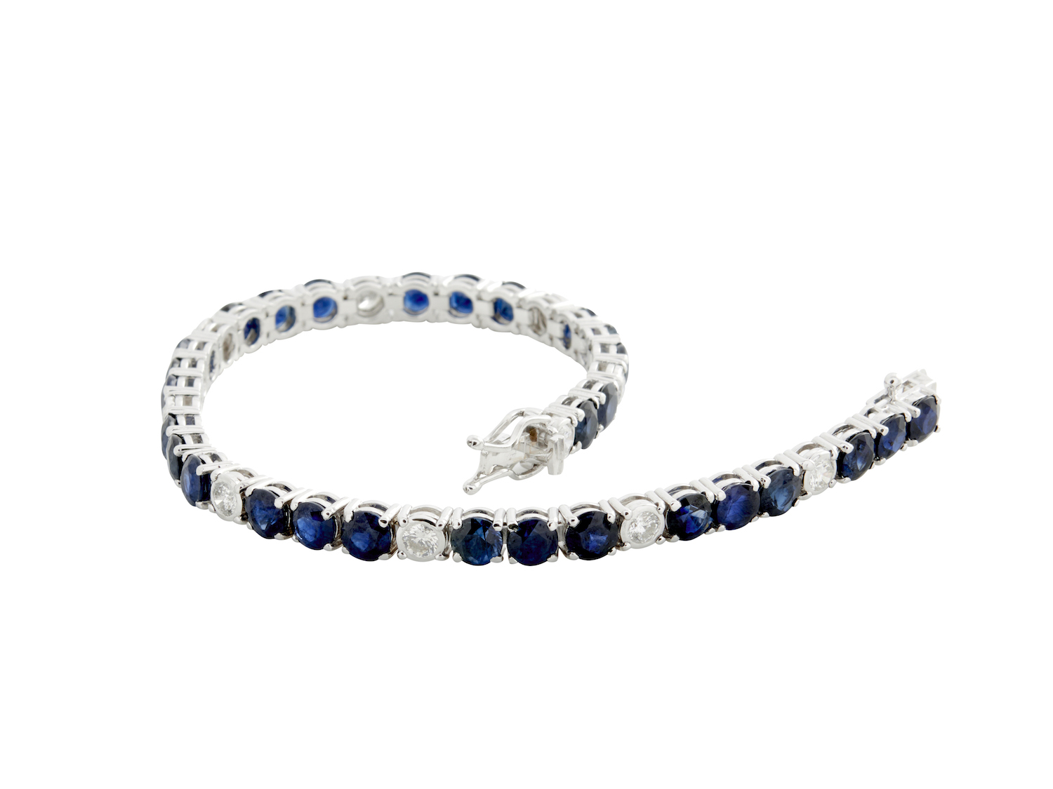 Designed as a line of claw-set circular-cut sapphires, spaced at intervals with ten collet-set brilliant-cut diamonds, the sapphires together weighing approximately 14.80 carats, the diamonds together weighing approximately 2.10 carats, completed by a tongue and groove clasp, length approximately 180mm.