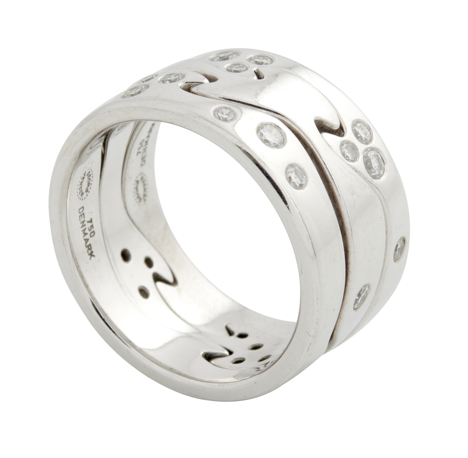 Comprising three interlocking bands, each hammer-set with brilliant diamonds together weighing approximately 0.57 carats, signed Georg Jensen, size N-O (55), accompanied by a Georg Jensen certificate.