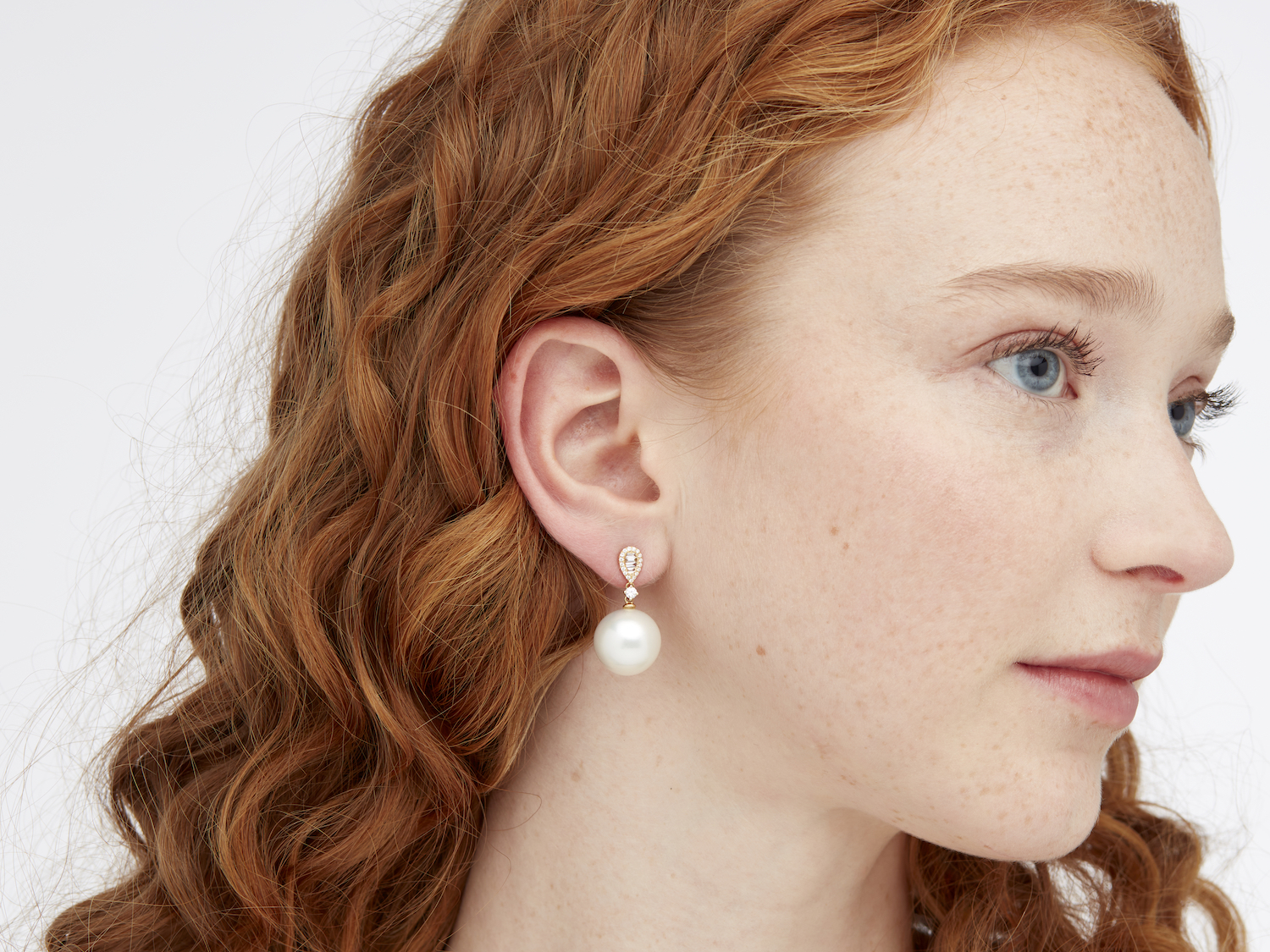 PAIR OF SOUTH SEA PEARL AND DIAMOND EARRINGS IN 18CT GOLD, EACH EARRING COMPRISING A PEARL OF WHITE HUES MEASURING APPROXIMATELY 15.00MM, SUSPENDED BELOW A SOLITAIRE DIAMOND AND DIAMOND CLUSTER SURMOUNT, THE DIAMONDS TOGETHER WEIGHING APPROXIMATELY 0.44 CARATS, TO POST AND BUTTERFLY FITTINGS, LENGTH APPROXIMATELY 28MM