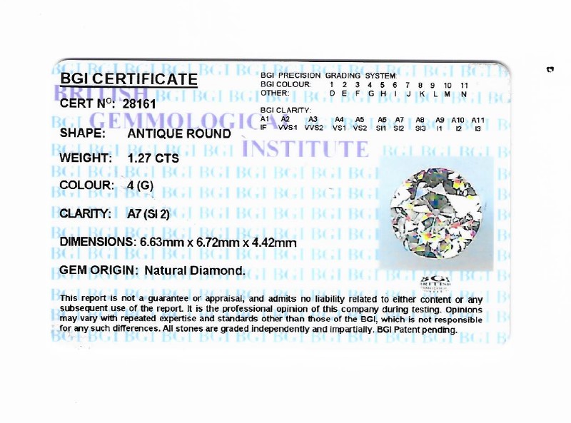 Accompanied by a British Gemmological Institute certificate numbered 28161, stating that the 1.27 carat diamond is natural, G colour, SI2 clarity.