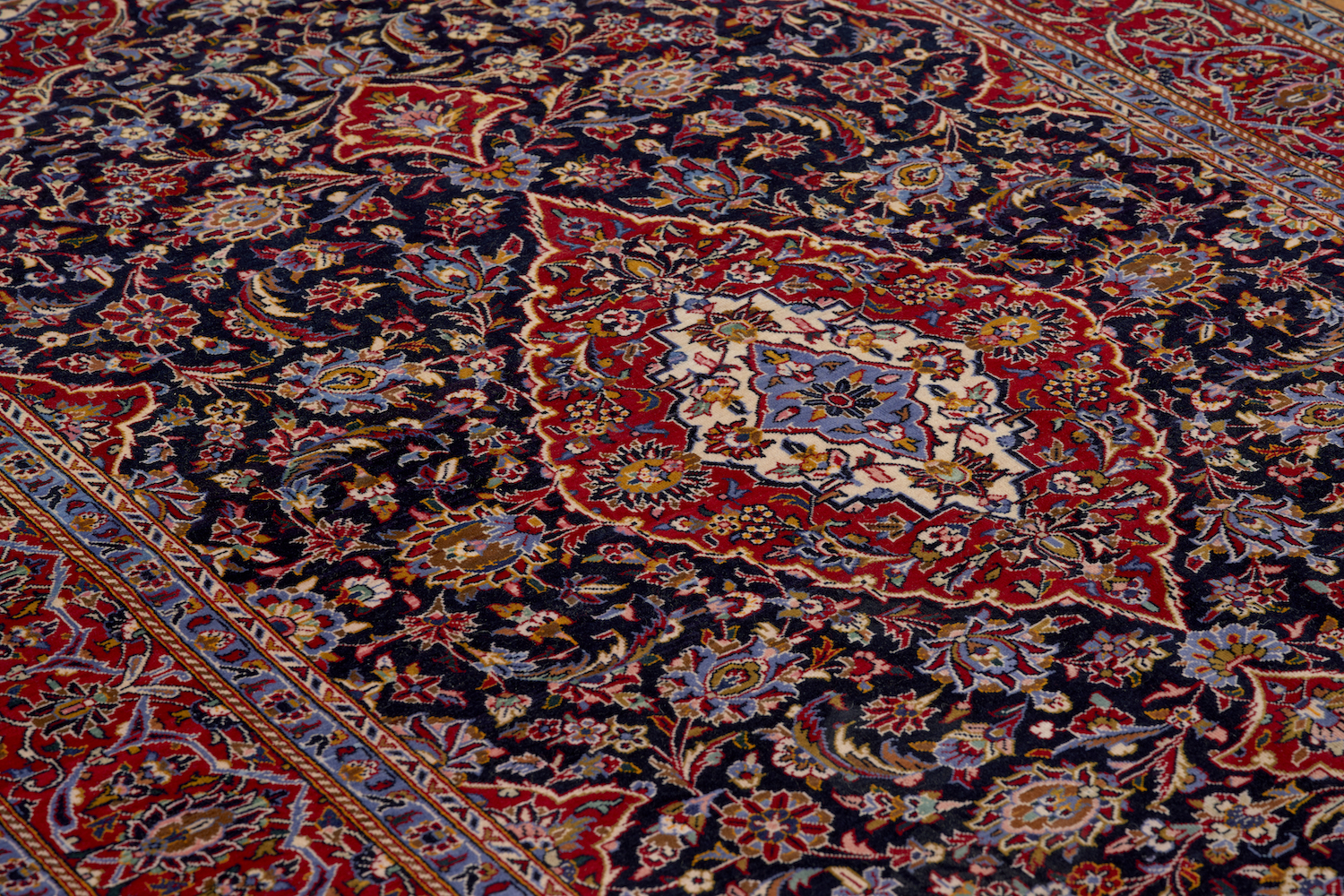 A BEAUTIFUL SUPERFINE HAND-KNOTTED PERSIAN ROYAL KASHAN RUG, 100% FINE LAMBS WOOL. CLASSIC KASHAN DESIGN OF A CENTRAL ELONGATED MEDALLION IN ROYAL RED ON A DEEP INDIGO ROYAL BLUE FIELD. WITH ALL-OVER SHAH ABBASI PALMETTES, SCROLLS, FLORAL MOTIFS & SAZ LEAVES. FLORAL CORNER MEDALLIONS IN FRENCH BLUE, IVORY AND RED. MAJOR BORDER OF SHAH ABBASI PALMETTES AND ESLIMI SCROLLS. IN PRISTINE CONDITION. SIZE: 222 X 145 CM ORIGIN: KASHAN/IRAN – RRP: $5,800 DOCUMENTATION OF AUTHENTICITY INCLUDED.