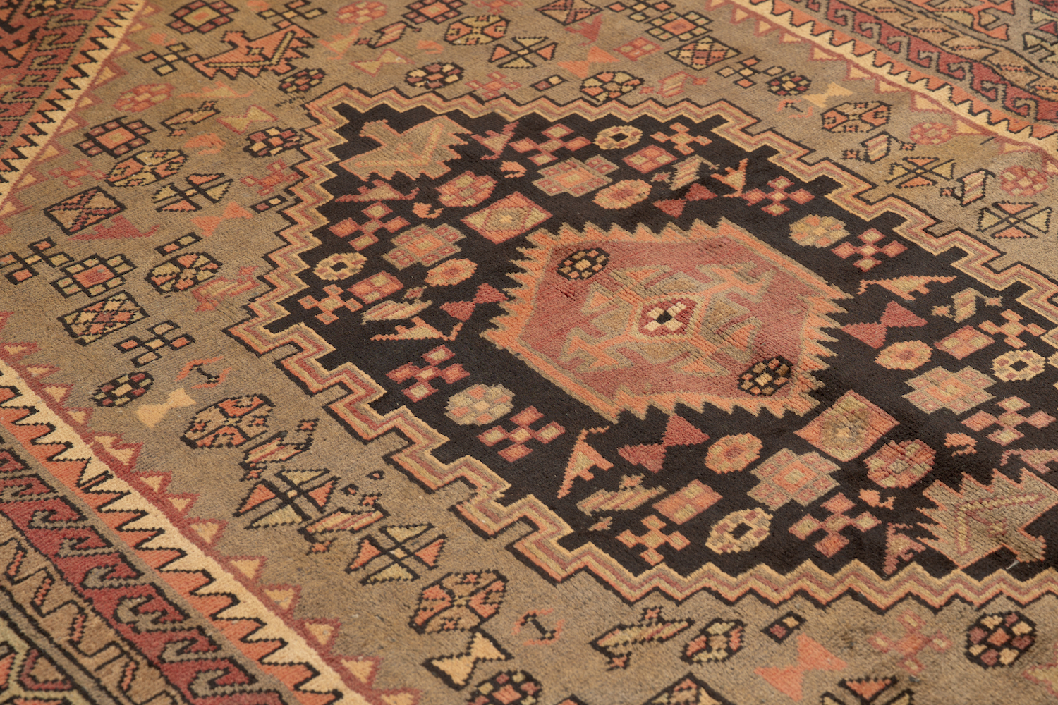 A TRIBAL PERSIAN KHAMSEH RUG. 100% HANDSPAN WOOL, NATURAL DYES, SEMI VINTAGE PILE. VILLAGE WEAVE FROM THE HAMADAN REGION WITH TRIBAL DESIGN OF GEOMETRIC PATTERNS AND ROSETTES ON A HEXAGONAL MEDALLION WITH ALL OVER TONES OF SAGE GREEN, CHARCOAL AND SOFT RED. SIZE: 227 X 146 CM ORIGIN: PERSIA - RRP: $1,200 DOCUMENTATION OF AUTHENTICITY INCLUDED