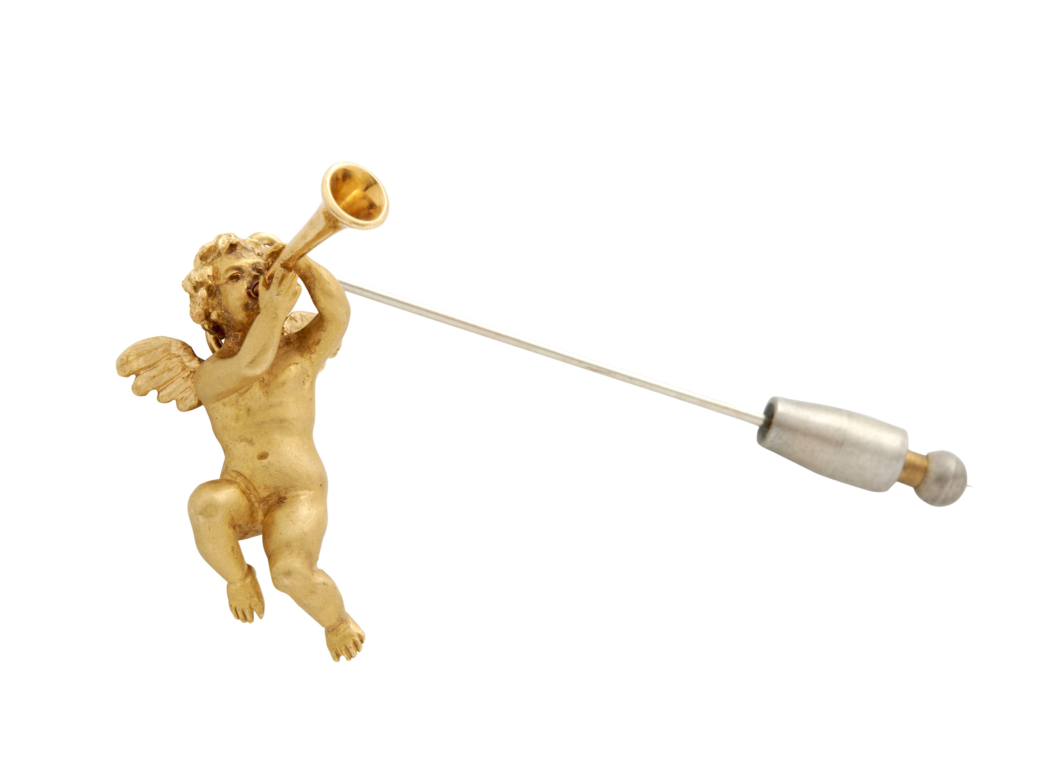Modelled as a cherub playing a trumpet, length approximately 32mm, gross weight approximately 16.4 grams.