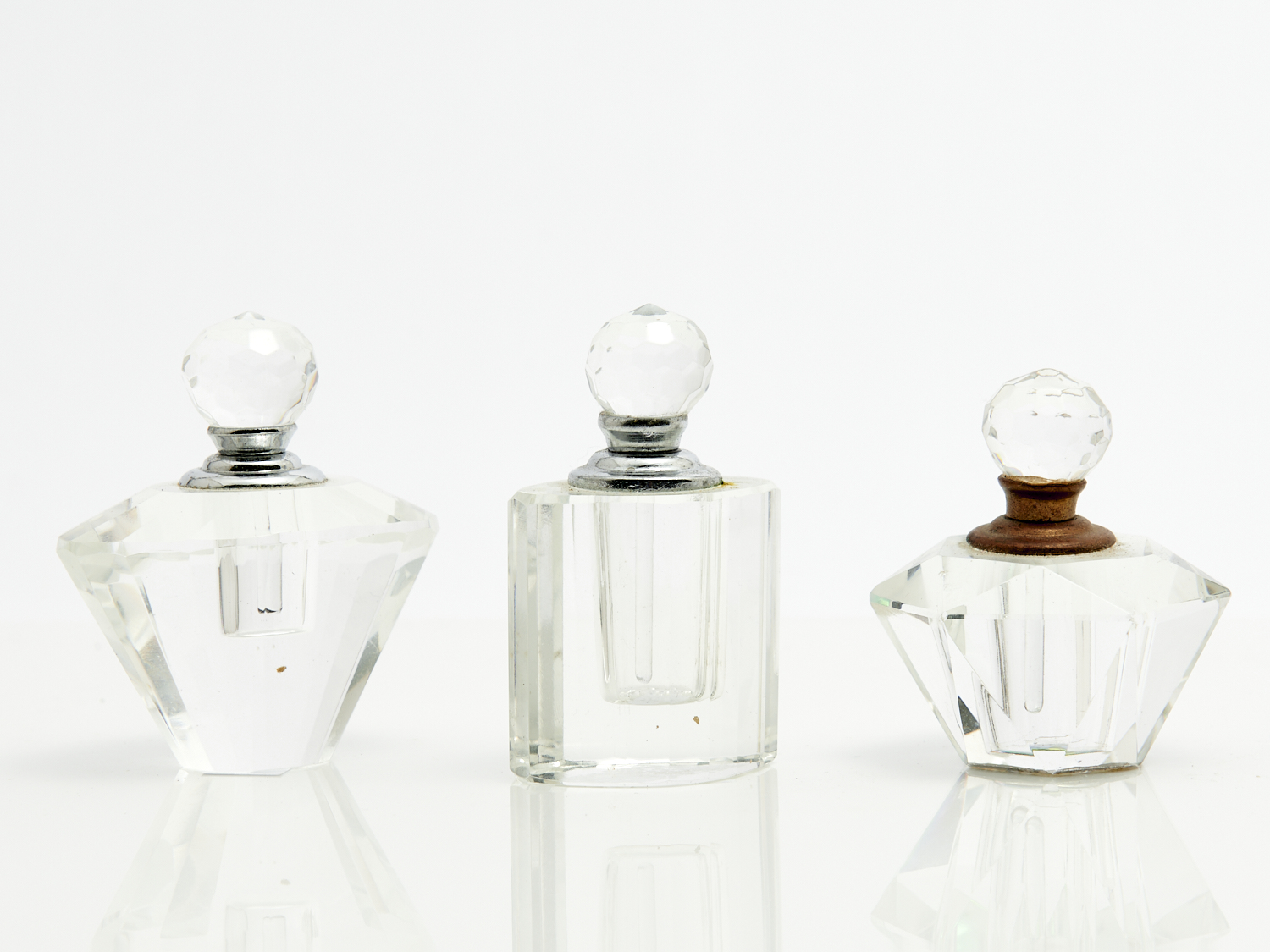 THREE CRYSTAL PERFUME BOTTLES H.7CM, LEONARD JOEL DELIVERY SIZE: SMALL