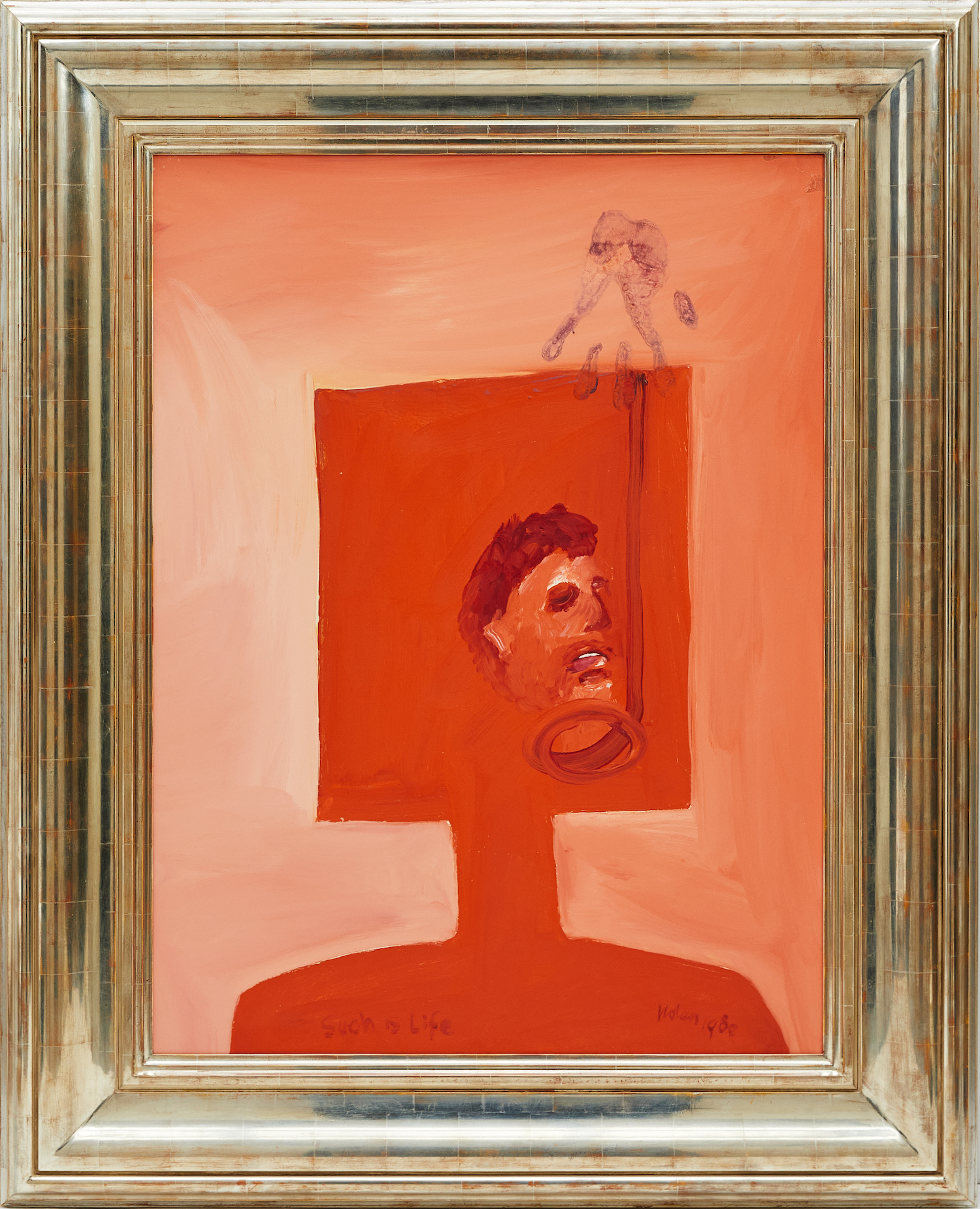 The artwork Mask (1980) depicts Kelly's last moments in a haze of orange layers, the prominent silhouetted mask depicted in a rich block of colour. A handprint and hanging noose draw the attention down to a portrait, presumably of Kelly, in the centre of the composition. The painterly marks draw an expressive portrait, conveying the harrowing moment. Trailing towards the bottom of the work, Nolan has inscribed Kelly's legendary (yet highly debated) last words "such is life," almost inconspicuously at the bottom on the canvas.