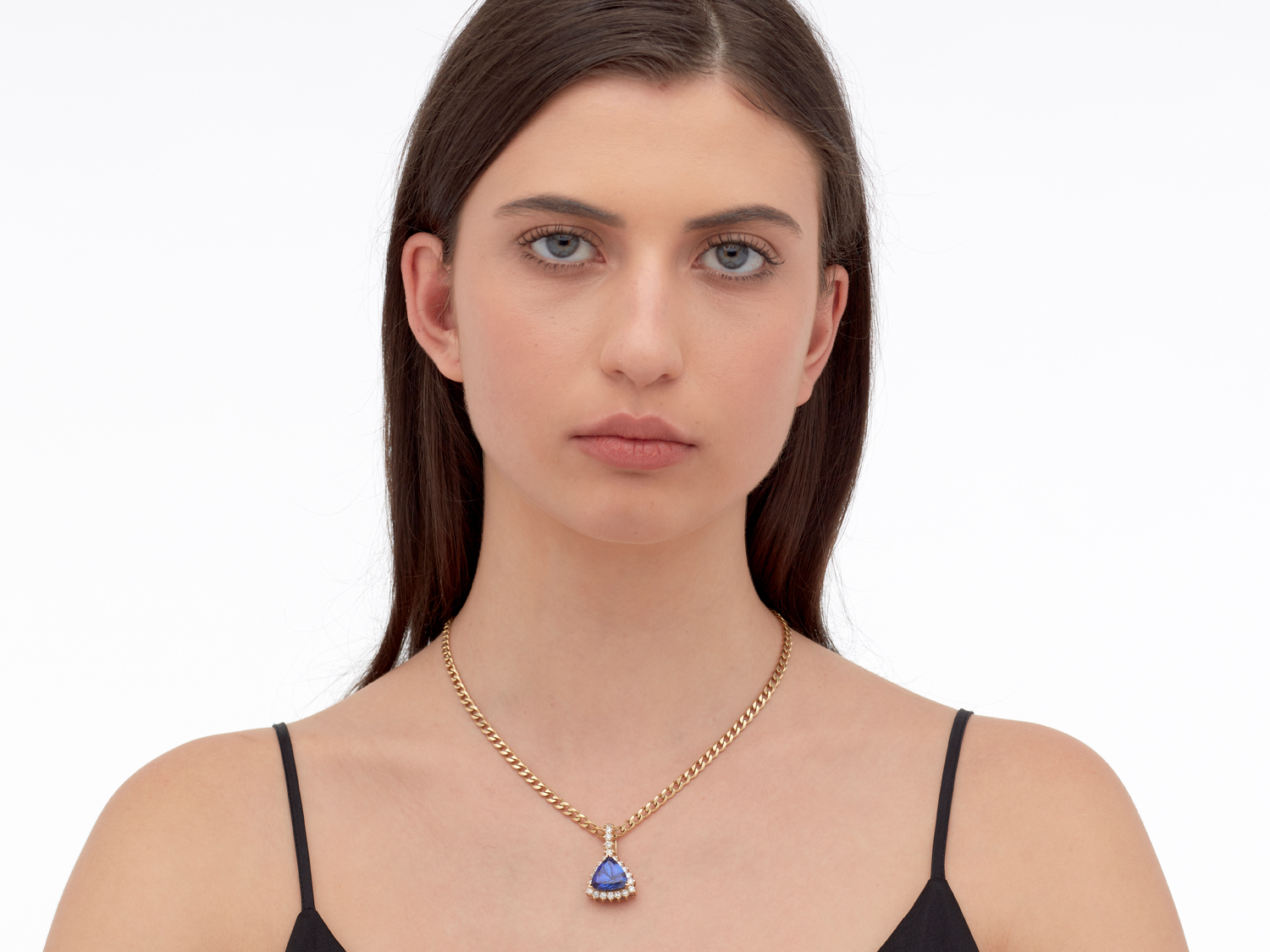 Comprising a claw-set trilliant-cut tanzanite weighing approximately 7.50 carats, within a surround of brilliant-cut diamonds below a diamond drop, the diamonds together weighing approximately 1.10 carats, suspended from a flat curblink chain in 9ct gold, completed by a parrot clasp, pendant length 30mm, chain length 450mm, gross weight approximately 24.5 grams.