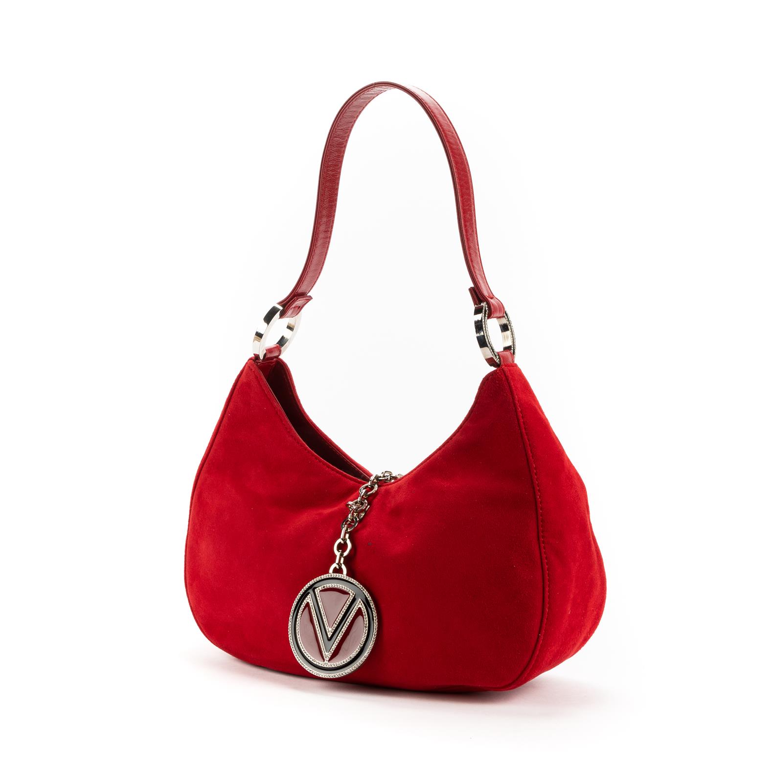 Styled in red suede leather with leather handle and silver tone metal, 26 x 15 x 8.5 cm