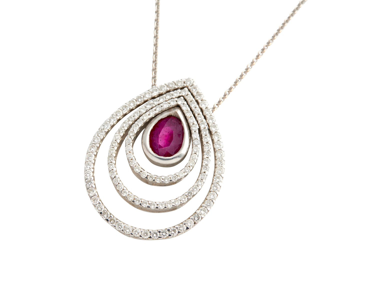 Centring a collet-set oval-cut ruby weighing approximately 1.20 carats, within concentric pear-shaped surrounds set throughout with brilliant-cut diamonds together weighing approximately 0.85 carats, suspended from a fine trace chain completed by a parrot clasp, pendant length 33, necklace length 415mm, gross weight approximately 11.5 grams.