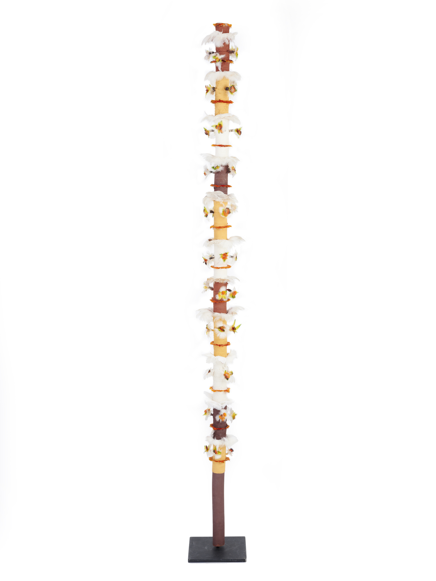 The flowers are the mokuy's (spirit of the deceased) nahta (food) - gingja, wild fruit. The ones on string are the ripe nahta the others are not ready to eat. The white feathers (going around pole) is the start of the travel, to call the clans from Ngaymil, Ramingining, Djapu, Rorruwy. The red (orange) one has arrived at all the clans. The bush string wrapped around the pole. The different places the Banumbirr travels to. White is the rising of the star. Orange (yellow) is when it is there and this black (brown) is when it is back home again and put in the bag.", The Artist, as stated on the Elcho Island Arts & Crafts certificate of authenticity
