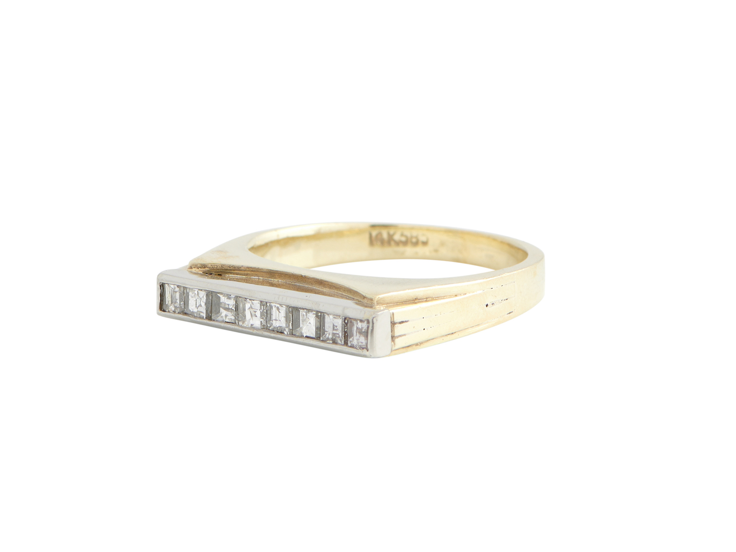 Modelled as a line of channel-set square emerald-cut diamonds, the diamonds together weighing approximately 0.32 carats, mounted in 14ct gold. size N, gross weight approximately 6 grams.