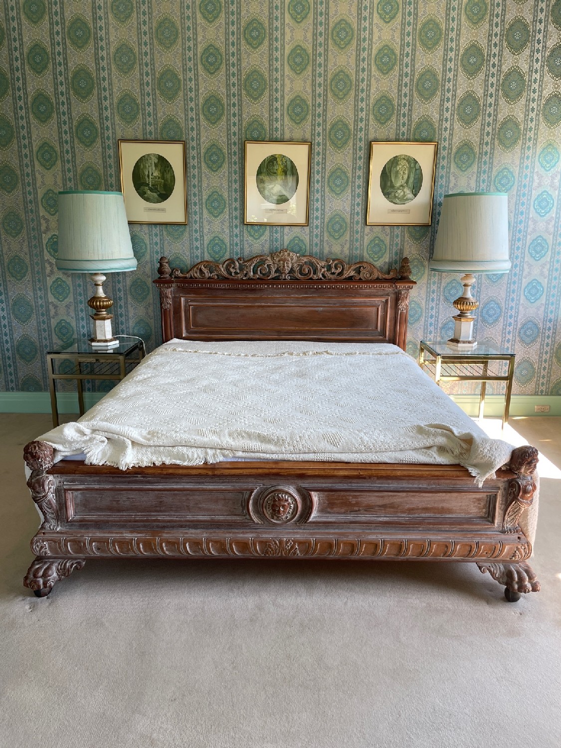 AN ORNATELEY CARVED CONTINENTAL BED (A/F) (BEDHEAD 120H X 172W CM) (PLEASE NOTE THIS HEAVY ITEM MUST BE REMOVED BY CARRIERS AT THE CUSTOMER'S EXPENSE. LEONARD JOEL STAFF CANNOT ASSIST CARRYING THIS ITEM) (LARGE ITEM)