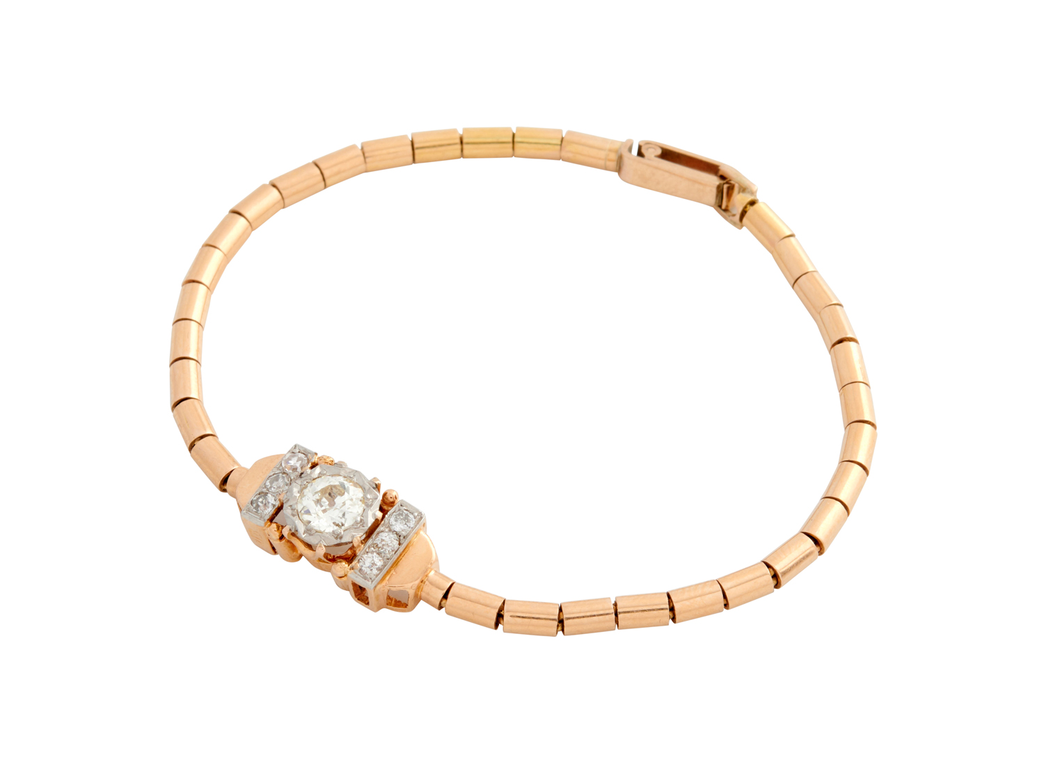 Comprising a geometric panel claw-set with old an European-cut diamond, flanked by rows of further diamonds, centered on a rounded link chain, the diamonds together weighing approximately 0.70 carats, completed by a clip clasp, length 170mm, gross weight approximately 10.5 grams.