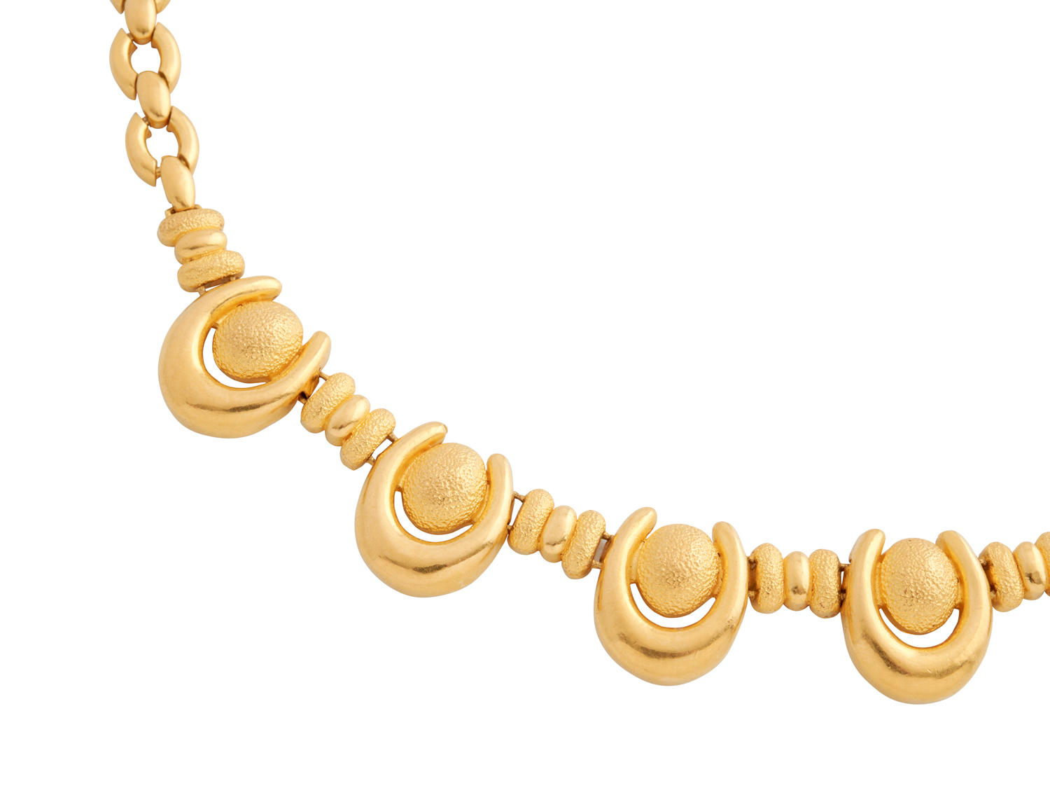 Comprising a central panel of textured links and horseshoe shaped links, to an integral link chain completed by an s-hook clasp, length approximately 450mm, gross weight approximately 76.4 grams.