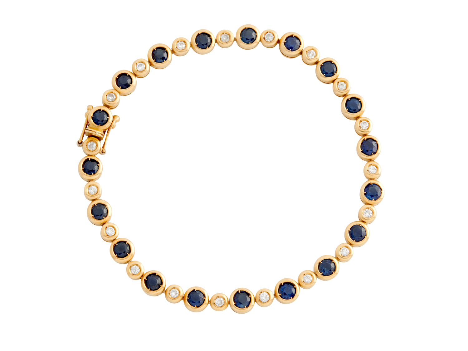 Designed as a line of alternating bezel-set circular-cut sapphires and brilliant-cut diamonds, the sapphires together weighing approximately 1.80 carats, the diamonds together weighing approximately 0.60 carats, completed by a tongue and groove clasp, length 192mm, gross weight approximately 19.5 grams.