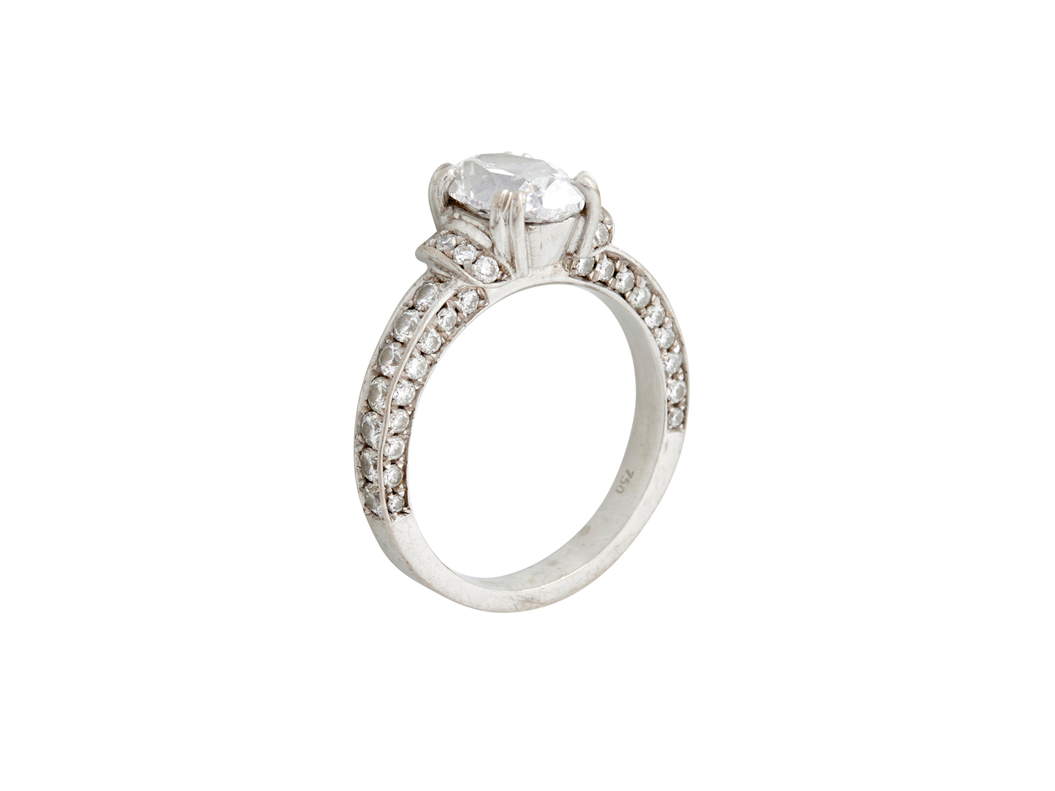 Claw-set with an oval-cut diamond weighing approximately 1.25 carats, the shoulders detailed with brilliant-cut diamonds together weighing approximately 0.80 carats, size L.
