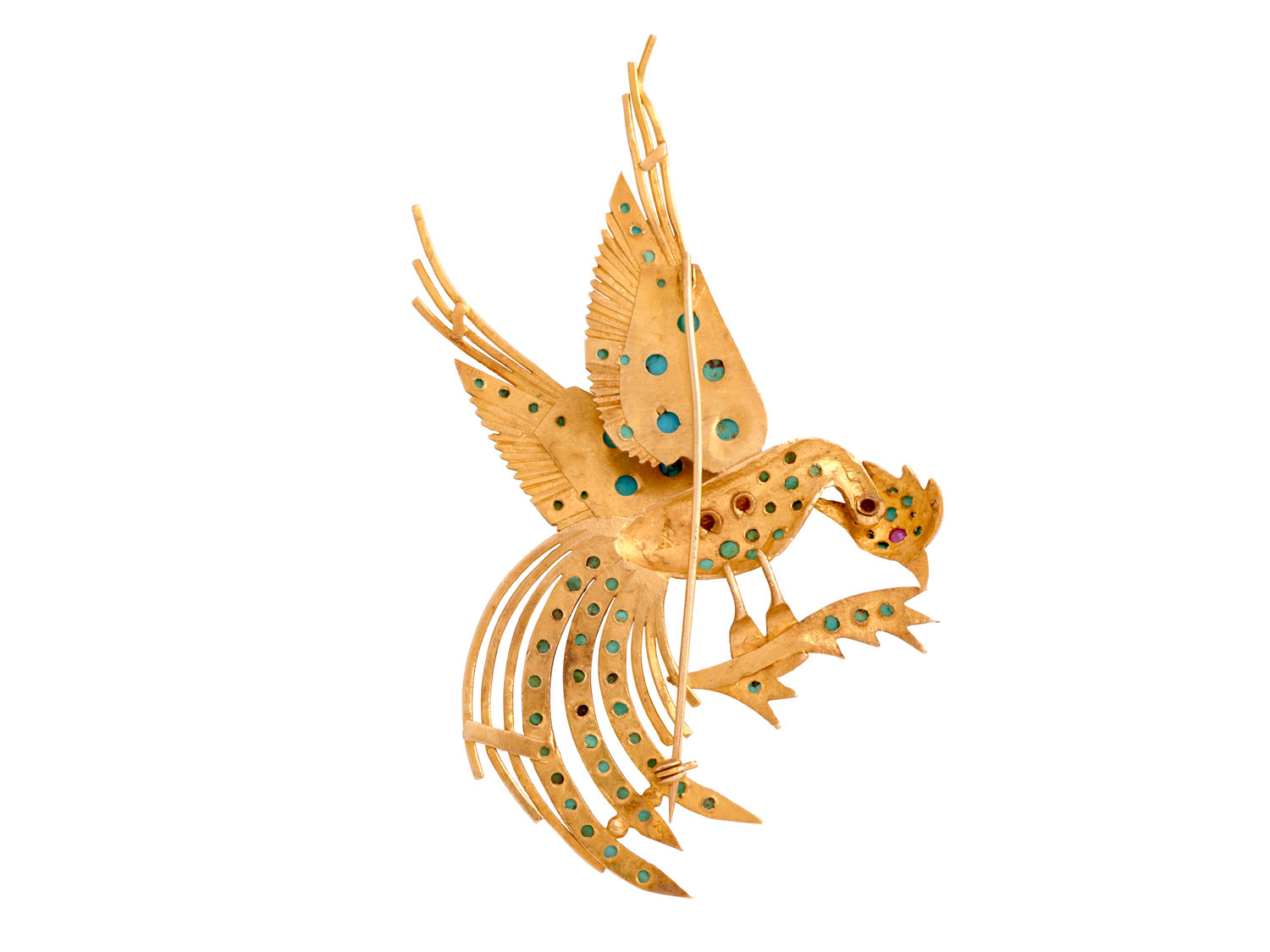 Modelled as an exotic bird perched on a branch, set throughout with oval and circular turquoise cut en cabochon, the eye detailed with a circular-cut synthetic ruby,