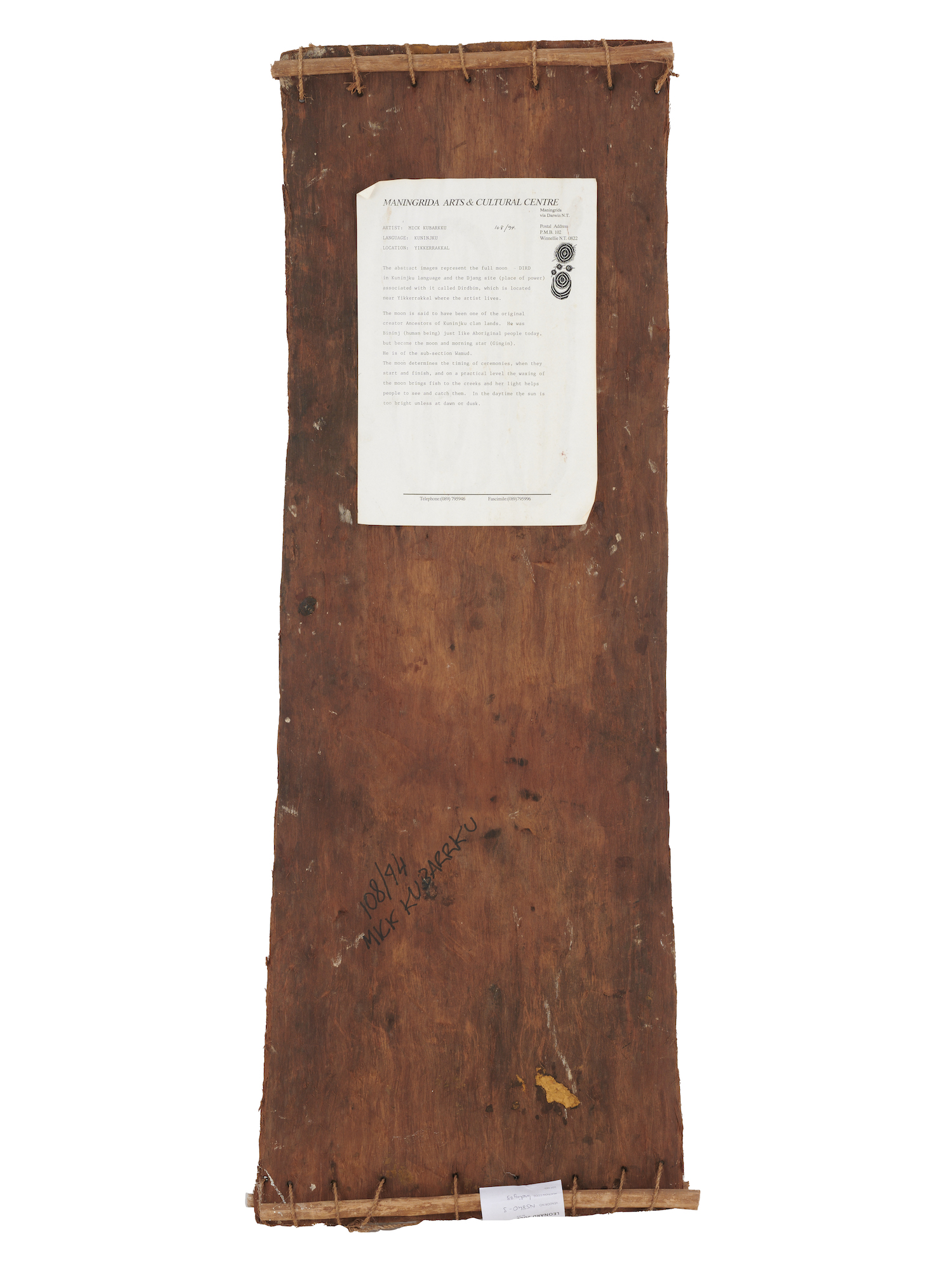 artist's name and cat. no. on Maningrida label verso