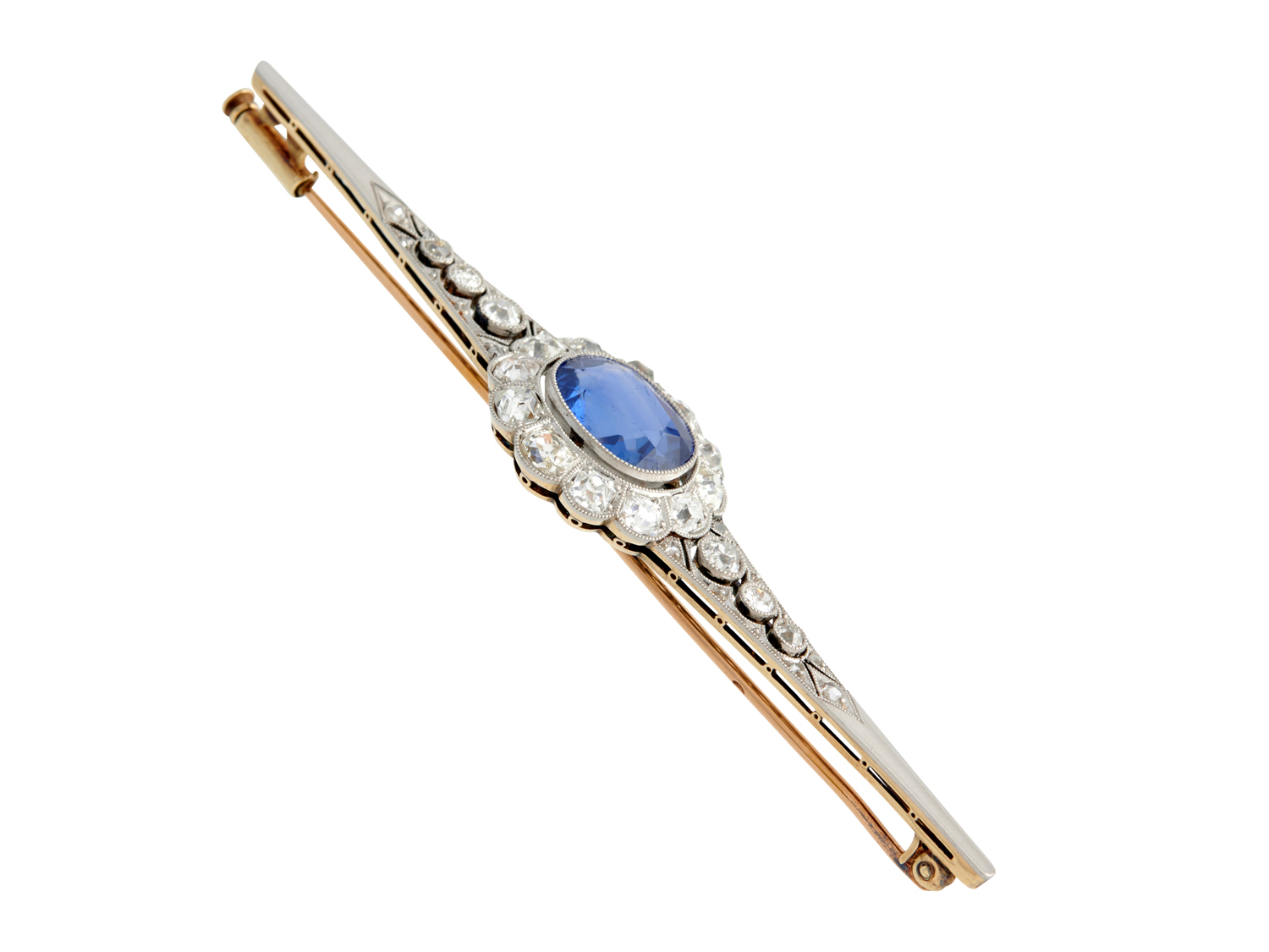 Of bar design, centring an oval-cut sapphire weighing approximately 4.50 carats within a surround of old mine-cut diamonds, flanked by pierced panels detailed with further diamonds, the diamonds together weighing approximately 1.76 carats, length 78mm, gross weight approximately 7.5 grams.