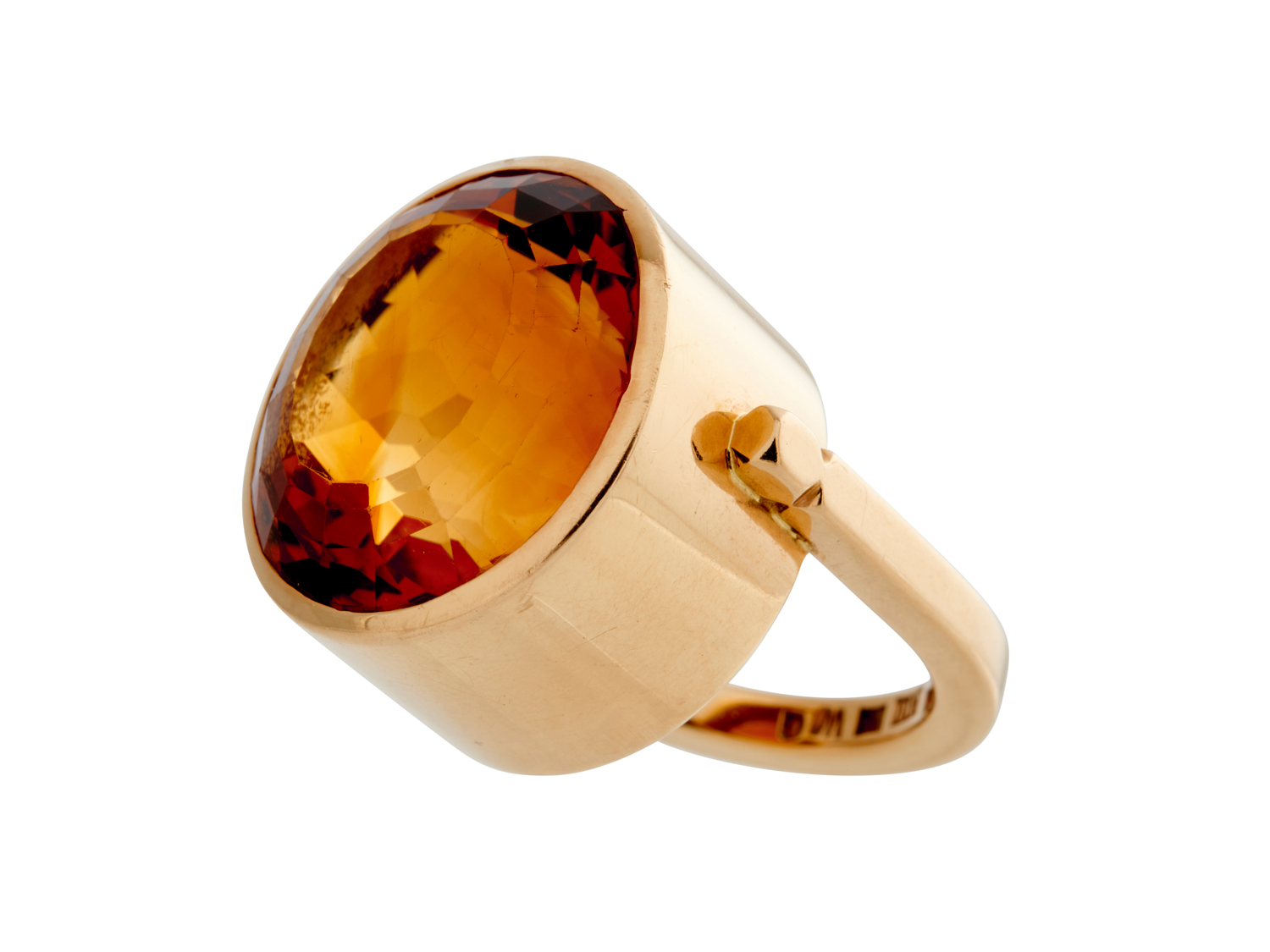 Centring an oval-cut citrine weighing approximately 20.00 carats, within a raised enclosed surround, signed 'SIGP' for Sigurd Persson, Swedish marks, size M, gross weight approximately 19.2 grams.