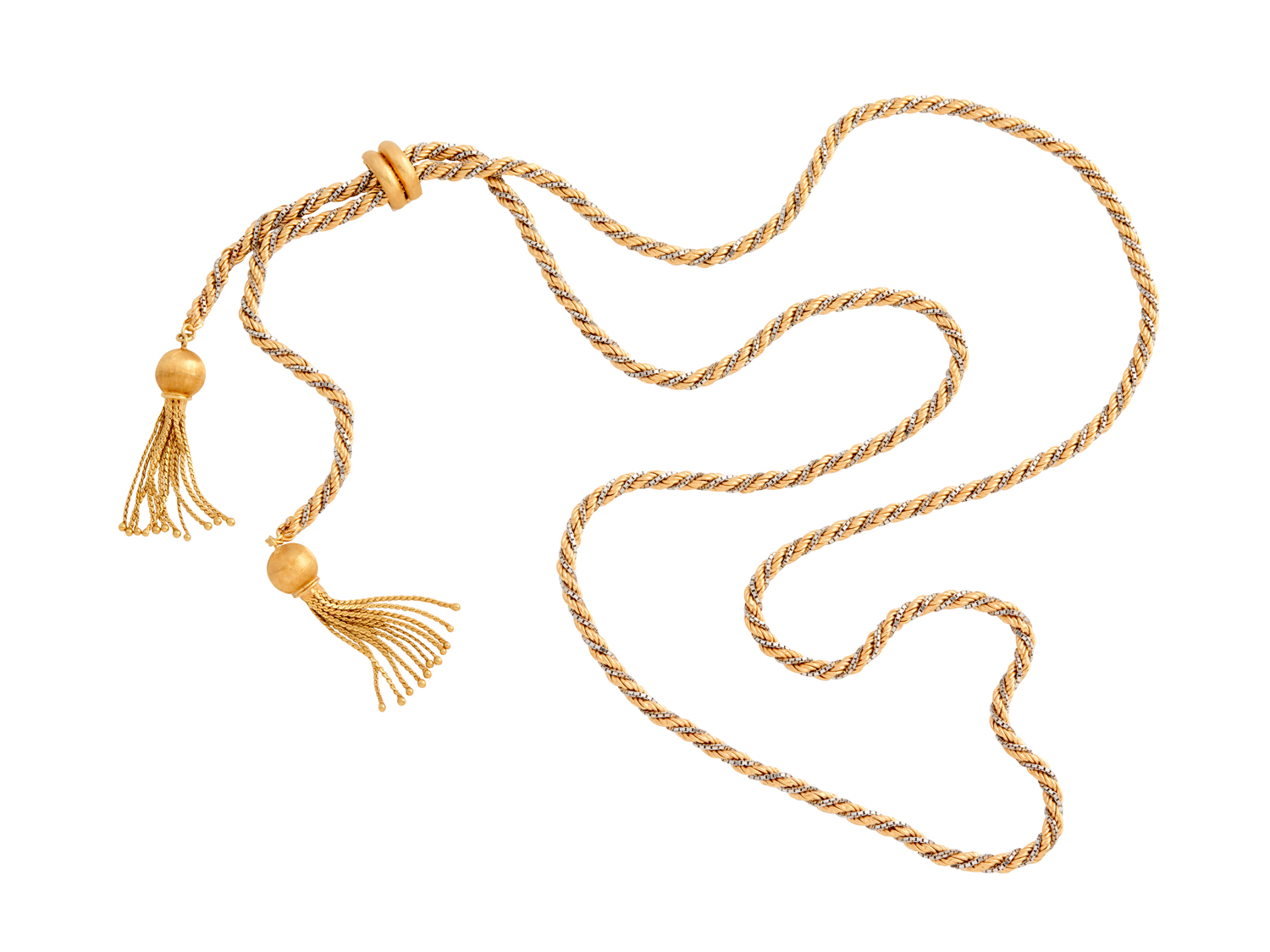 Of lariat design, comprising a ropetwist chain entwined with a contrast box link chain, terminating in brushed gold balls suspending chain tassels, with adjustable bushed gold clip, total length 1300mm adjustable, gross weight approximately 89.5 grams.