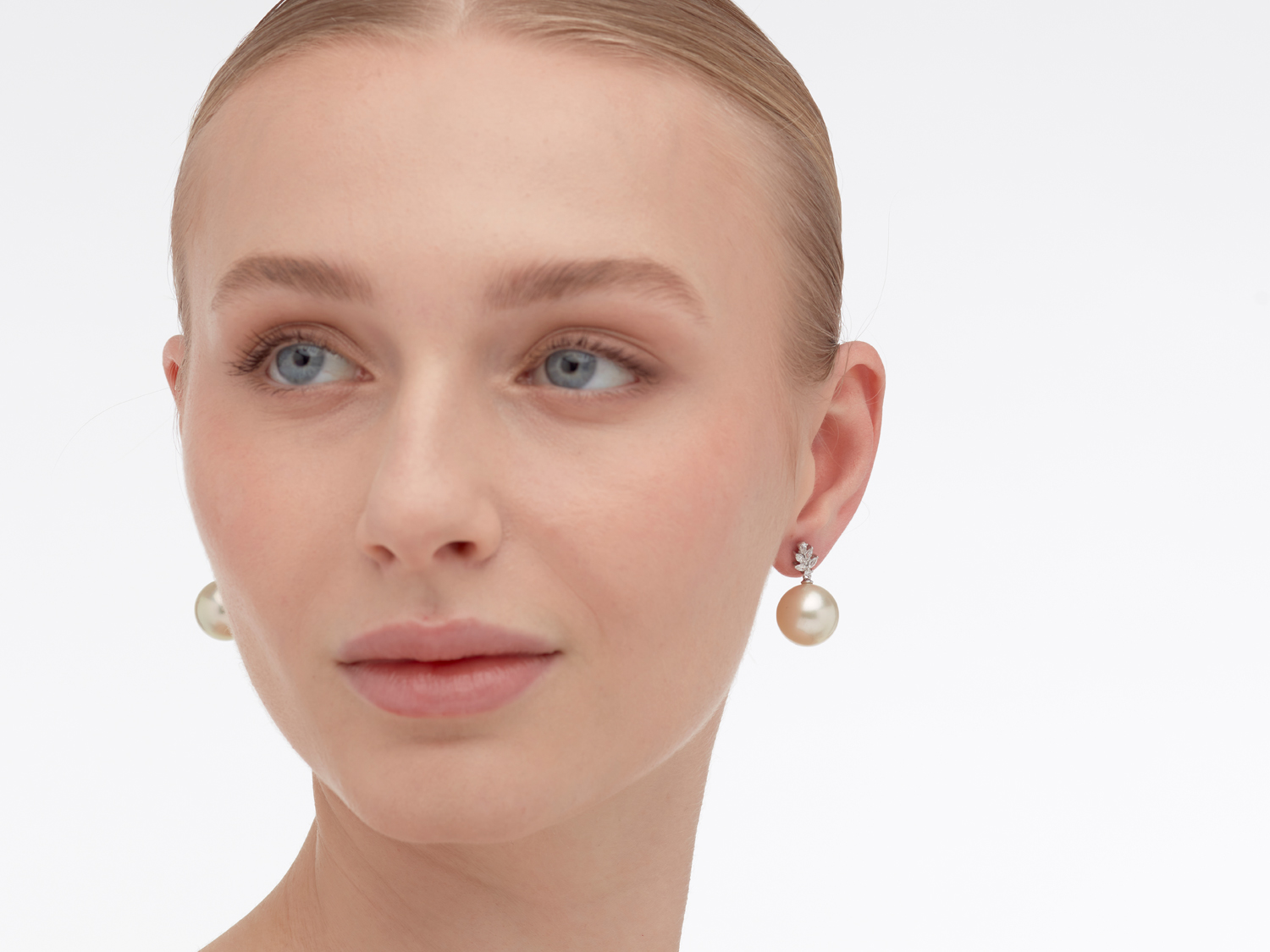Each earring comprising a round pearl of cream white hues measuring approximately 15.20mm, suspended below a foliate diamond drop, the diamonds together weighing approximately 0.36 carats, to post and butterfly fittings, length 27mm.