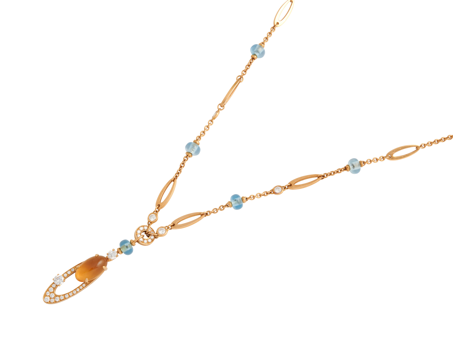 Terminating in an openwork elliptical plaque, embellished with brilliant-cut diamonds and a claw-set cabochon citrine, supported from a brilliant-cut diamond and topaz bead drop, to an integral chain necklace decorated at intervals with openwork links, bezel-set brilliant-cut diamonds and rondelle topaz beads, the diamonds together weighing approximately 1.20 carats, completed by a parrot clasp, signed Bulgari, length 380mm-440mm adjustable, gross weight approximately 23.0 grams.