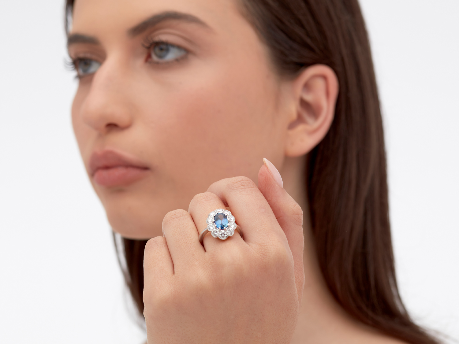 Of cluster design, centring a claw-set oval-cut sapphire weighing approximately 2.36 carats, within a surround of brilliant-cut diamonds together weighing approximately 2.00 carats, size O.
