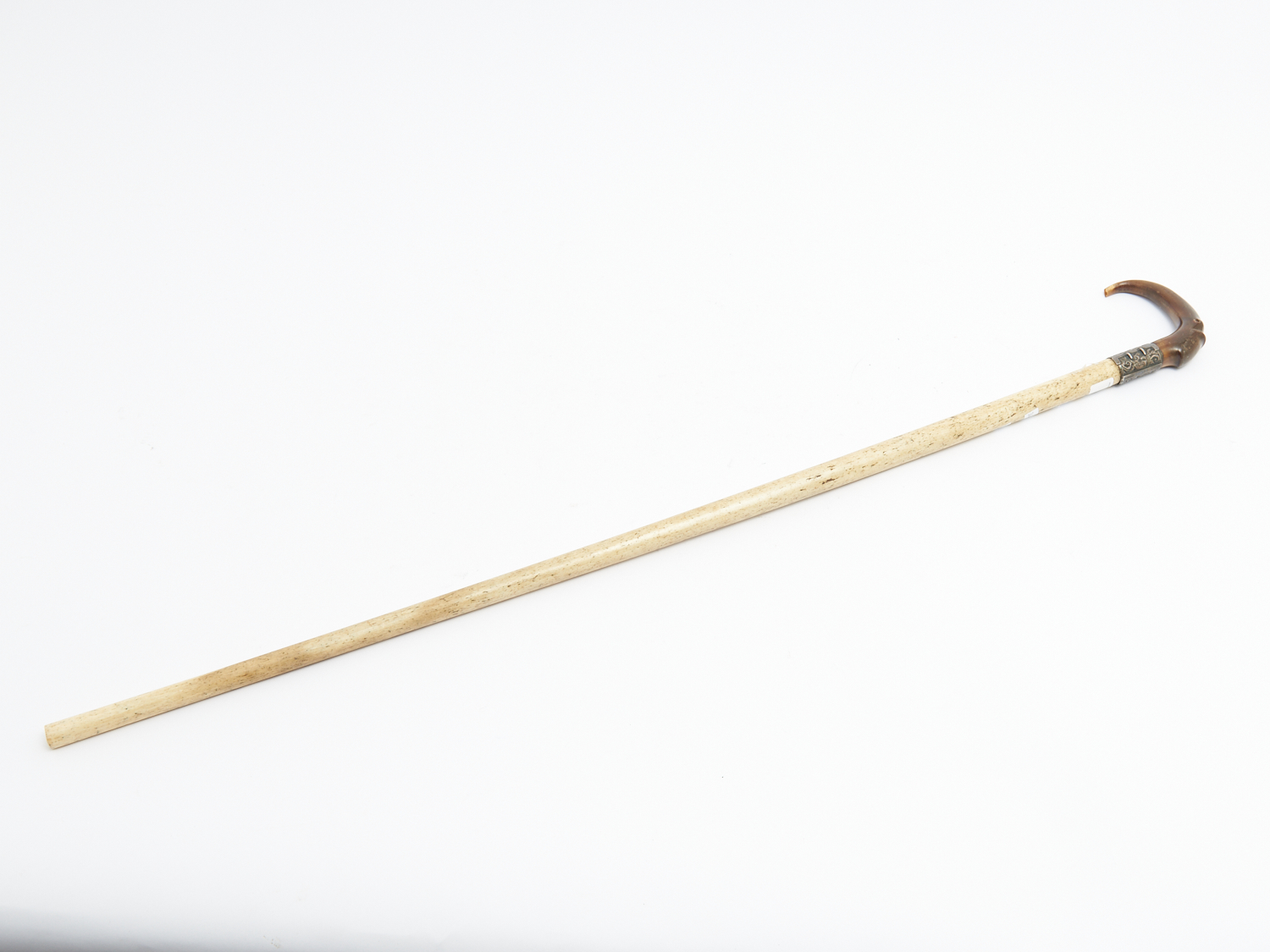 A WHALEBONE CANE WITH HORN HANDLE AND SILVER COLLAR, 19TH CENTURY, 87 CM LONG FROM THE MARITIME COLLECTION OF DESMOND ADCOCK, LEONARD JOEL DELIVERY SIZE: SMALL