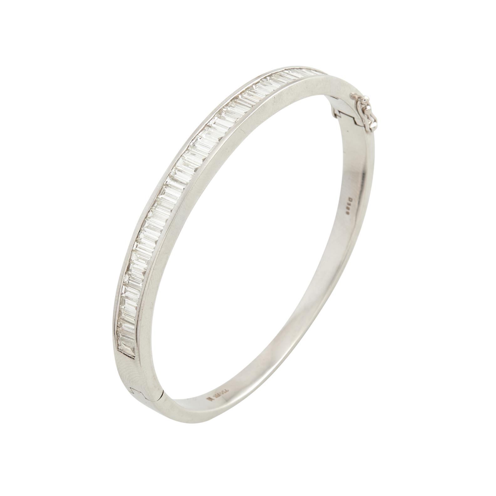 The hinged oval bangle, channel-set with baguette-cut diamonds together weighing approximately 3.89 carats, inner circumference approximately 170mm, gross weight 27.7 grams.