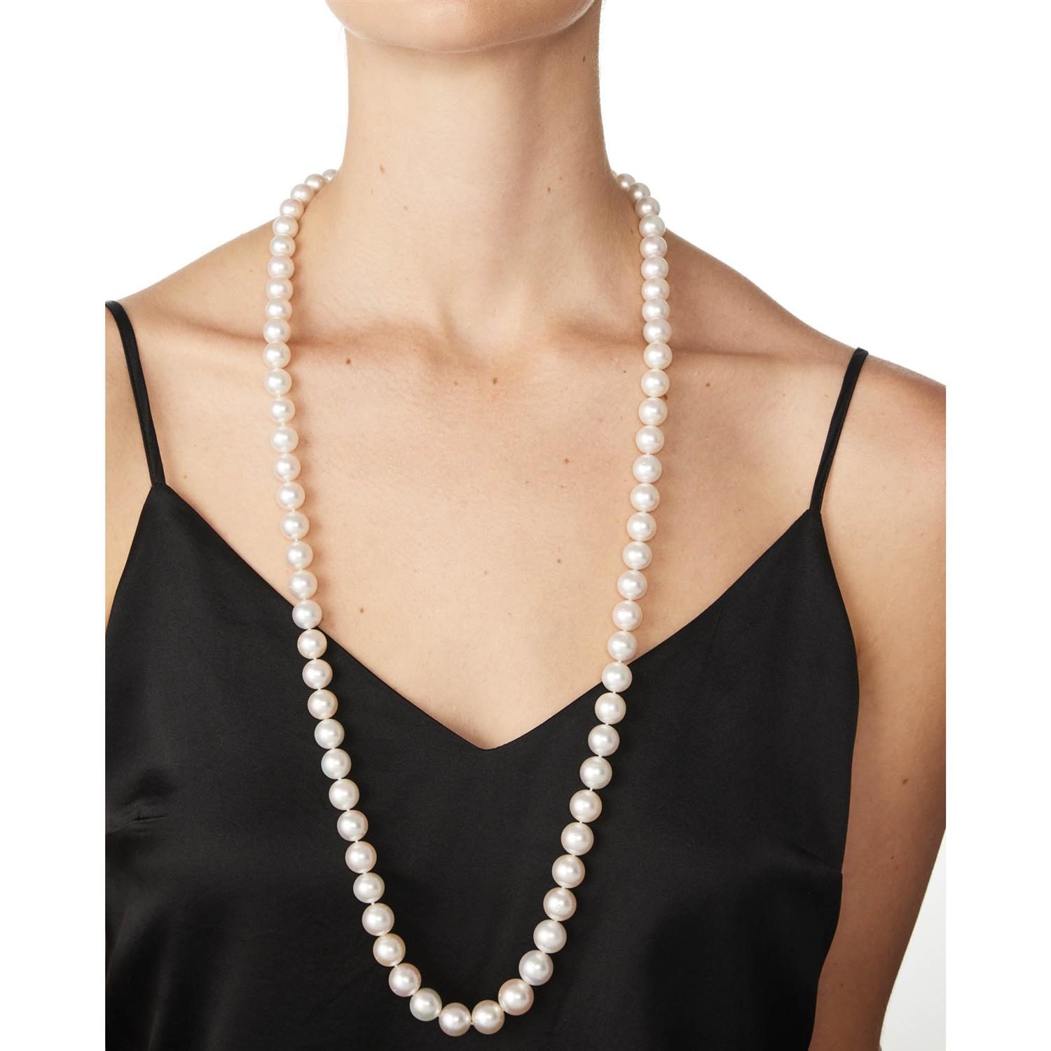 Composed of 76 cultured pearls, graduating from approximately 10mm to 13mm, completed by a diamond set 14ct white gold ball clasp, the diamonds together weighing approximately 0.09 carats, inner circumference 910mm.