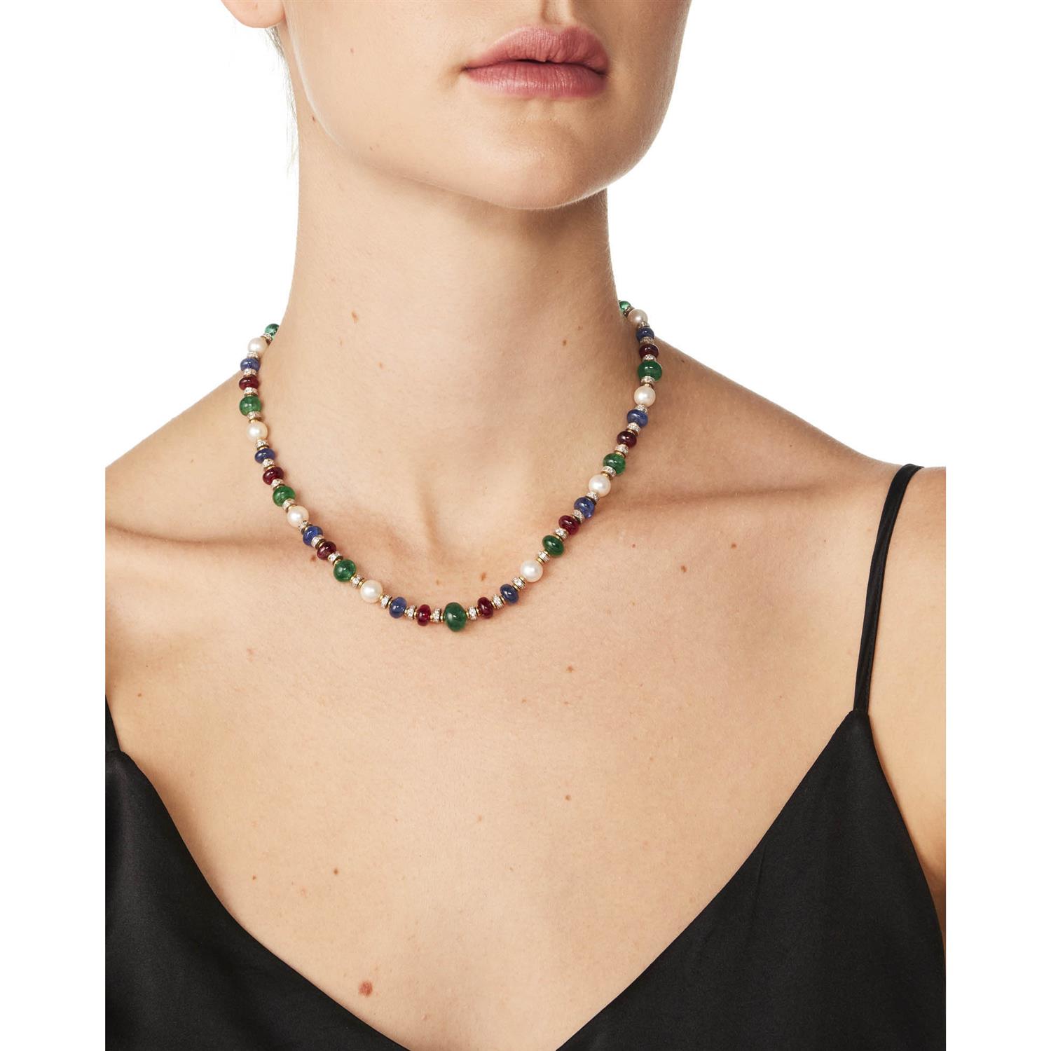 Composed of a line of cultured pearls, graduated spheroid-shaped emerald, sapphire and ruby beads alternating between white gold rondelle spacers pavé-set with brilliant-cut diamonds flanked by gold accents, completed by an 18ct gold barrel box clasp embellished at intervals with diamonds, the diamonds together weighing approximately 1.00 carats, inner circumference 440mm.