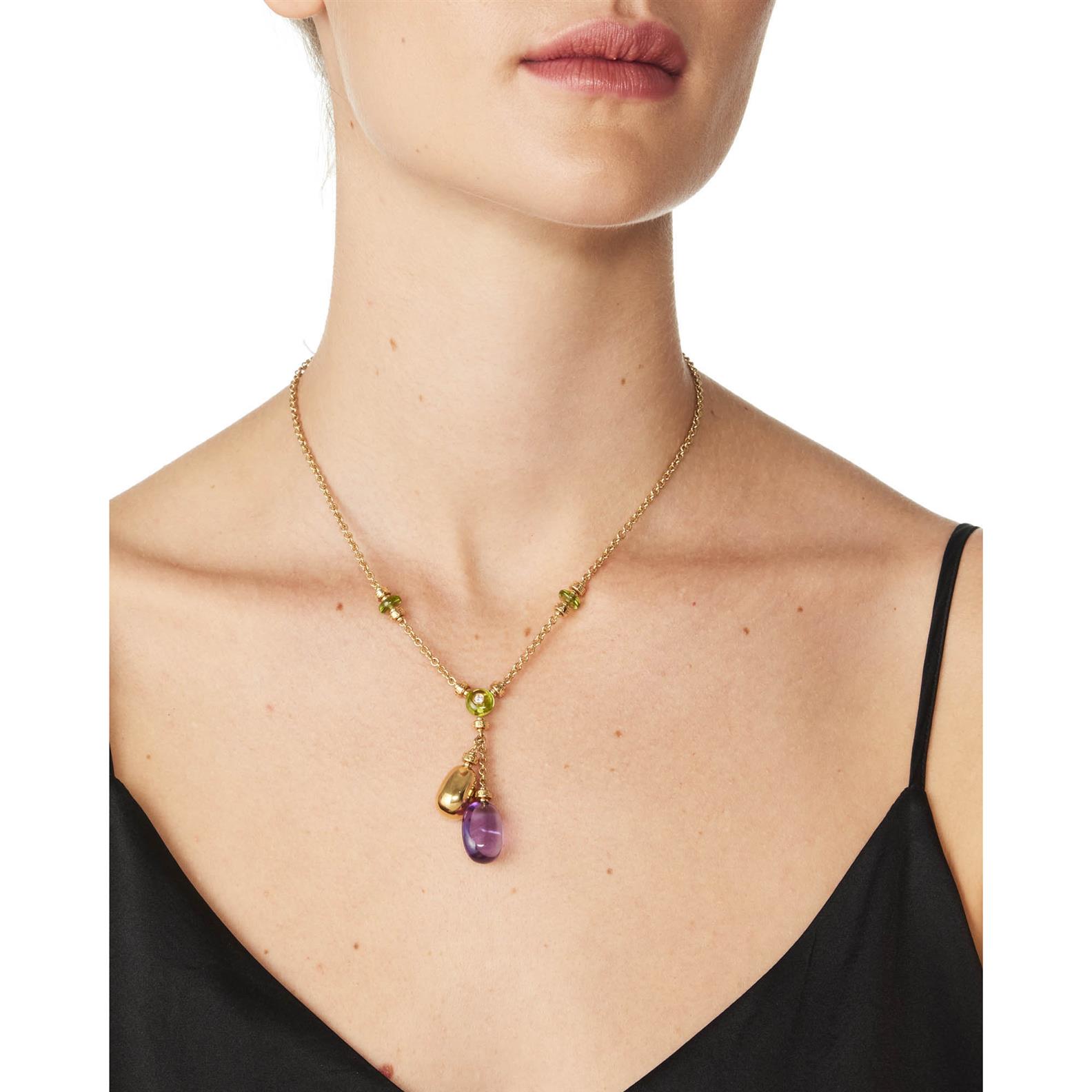 Composed of a trace link chain centring a spheroid peridot bead embellished with a brilliant-cut diamond flanked by a pair of gold rondels, engraved with a 'BVLGARI' repeating logotype further flanked by a spheroid peridot between an engraved gold rondel terminating on a trace link tassel supporting an amethyst bead and a gold nugget swing drop surmounted by an engraved gold rondel, circumference 440mm, adjustable, Italian workshop registration and maker's marks, signed Bulgari, Made in Italy.
