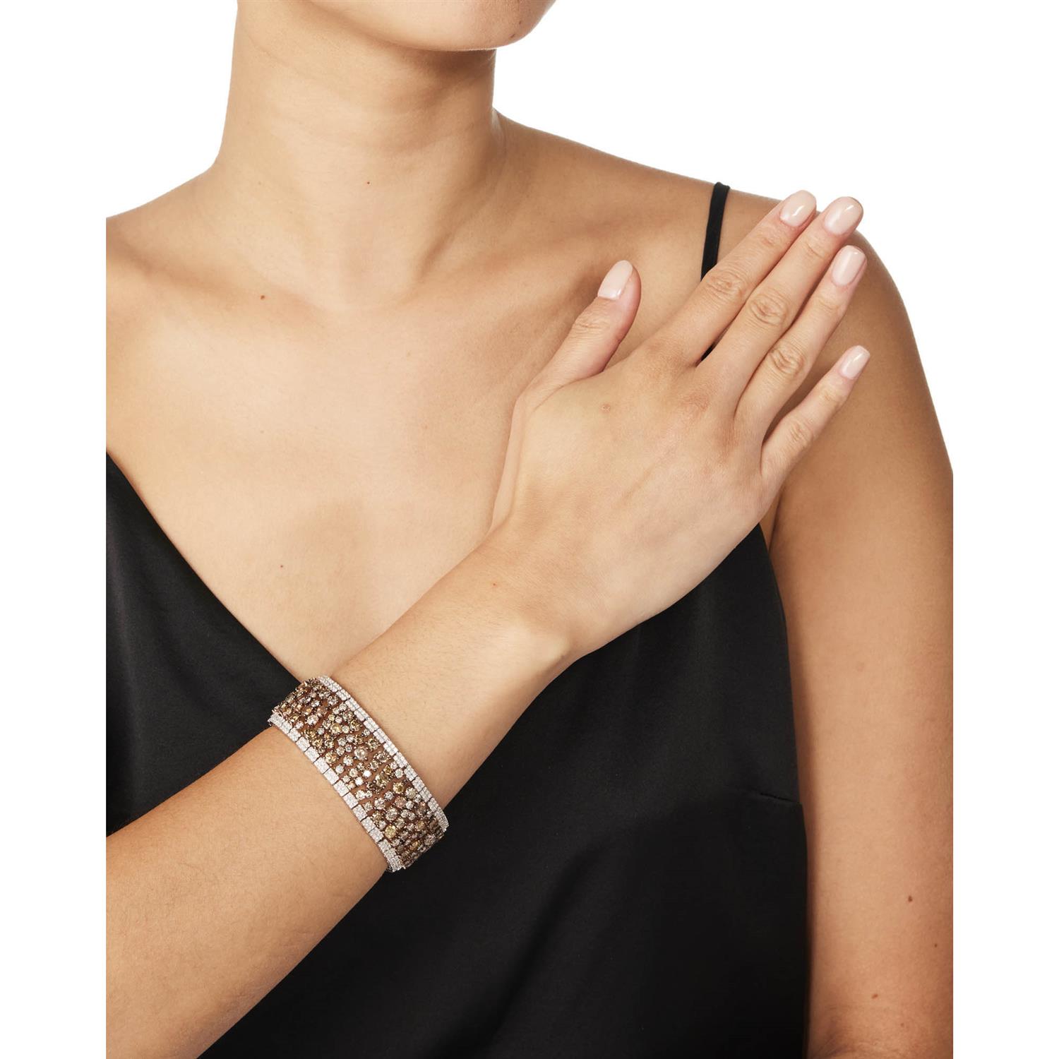Designed as a 25mm wide openwork strap, centring an asymmetrical cluster of claw-set circular-cut diamonds of brown tint between a border of pavé-set near colourless diamonds, the diamonds together weighing approximately 42.19 carats, mounted in 14ct gold, length 190mm.