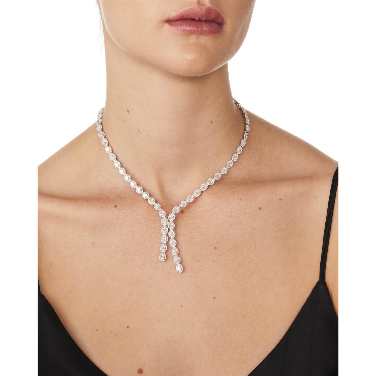 Composed of a line of clusters, centring a claw-set oval diamond framed by a halo of pavé-set brilliant-cut diamonds, completed by a concealed box clasp, terminating on a similarly set tassel, the diamonds together weighing approximately 24.26 carats, mounted in 18ct white gold, inner circumference 450mm.