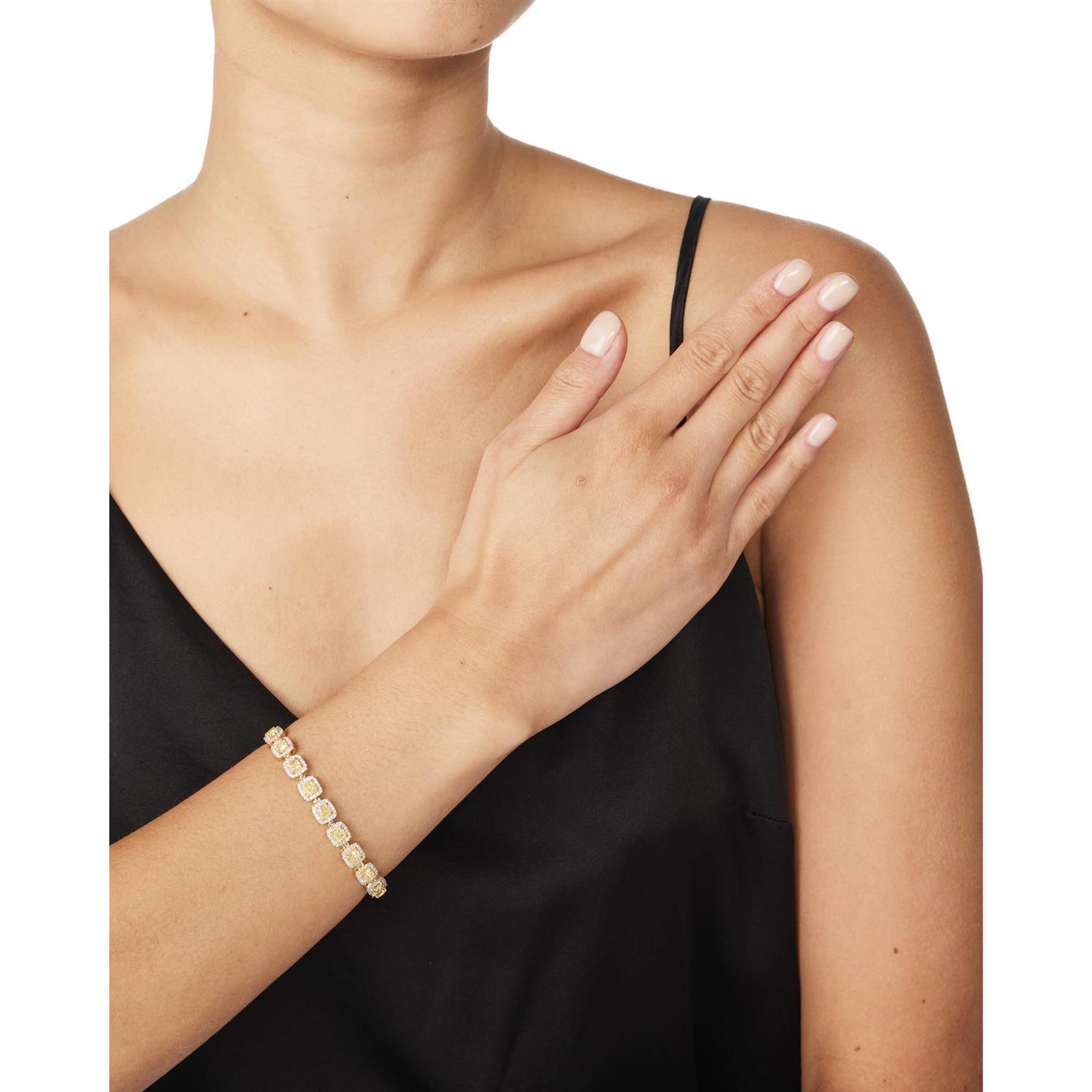 Designed as a line of clusters, each centring a claw-set radiant-cut diamond of yellow tint framed by a halo of near colourless pavé-set brilliant-cut diamonds, completed by a concealed box clasp, the coloured and near colourless diamonds together weighing approximately 6.91 carats and 1.77 carats respectively, mounted in 18ct gold, length 180mm.