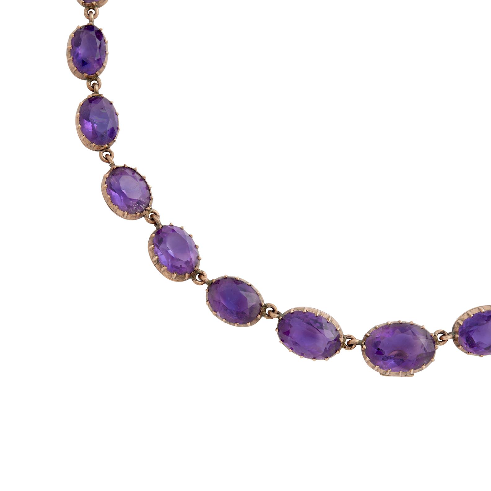 Comprising twenty-six graduating oval-cut amethysts, completed by a concealed tongue and groove clasp, mounted in rolled gold, length 360mm.