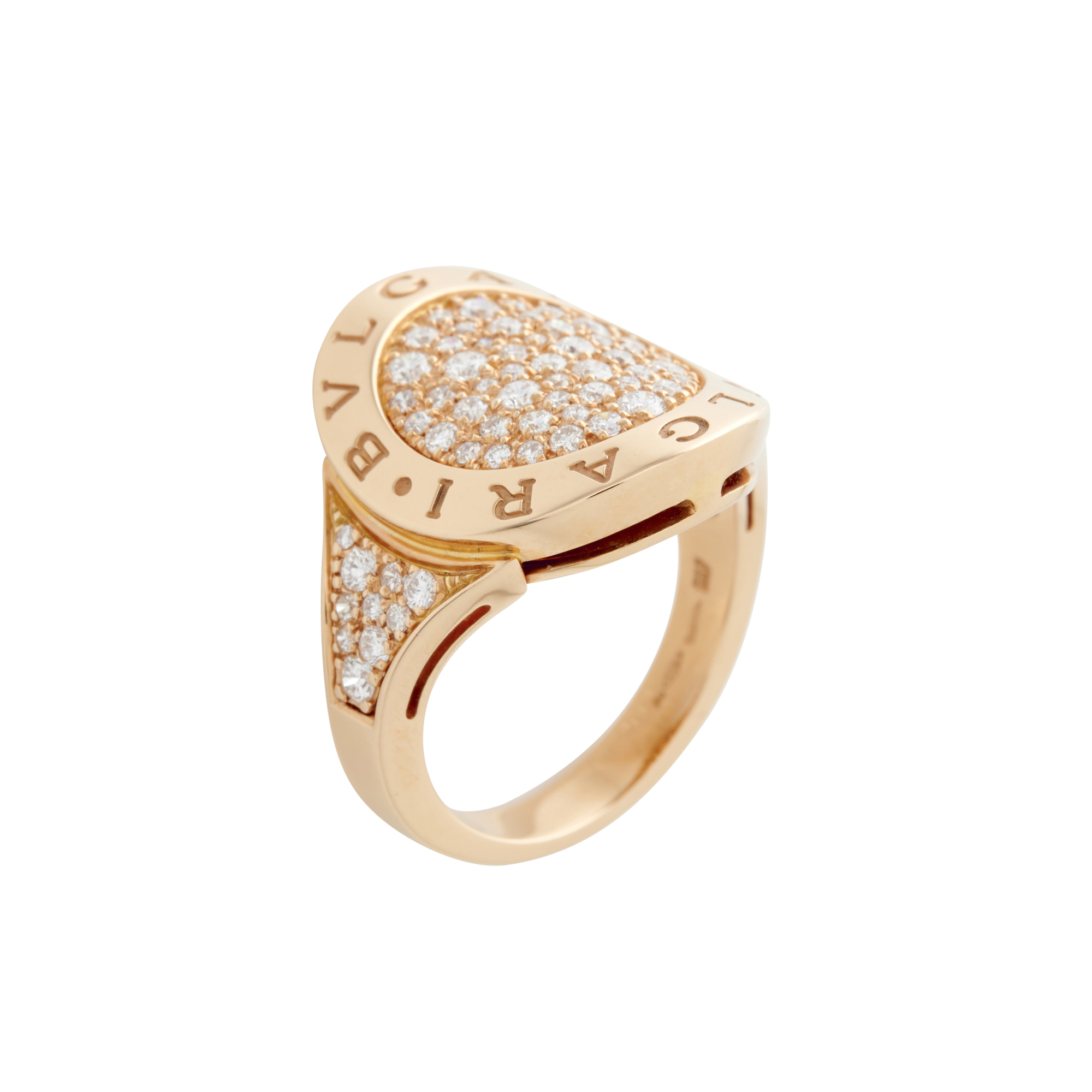Comprising a concave shield, pavé-set with brilliant cut diamonds within a polished gold border engraved BVLGARI BVLGARI between pavé-set diamond shoulders, the diamonds together weighing approximately 0.90 carats, signed with Italian marks, size P.