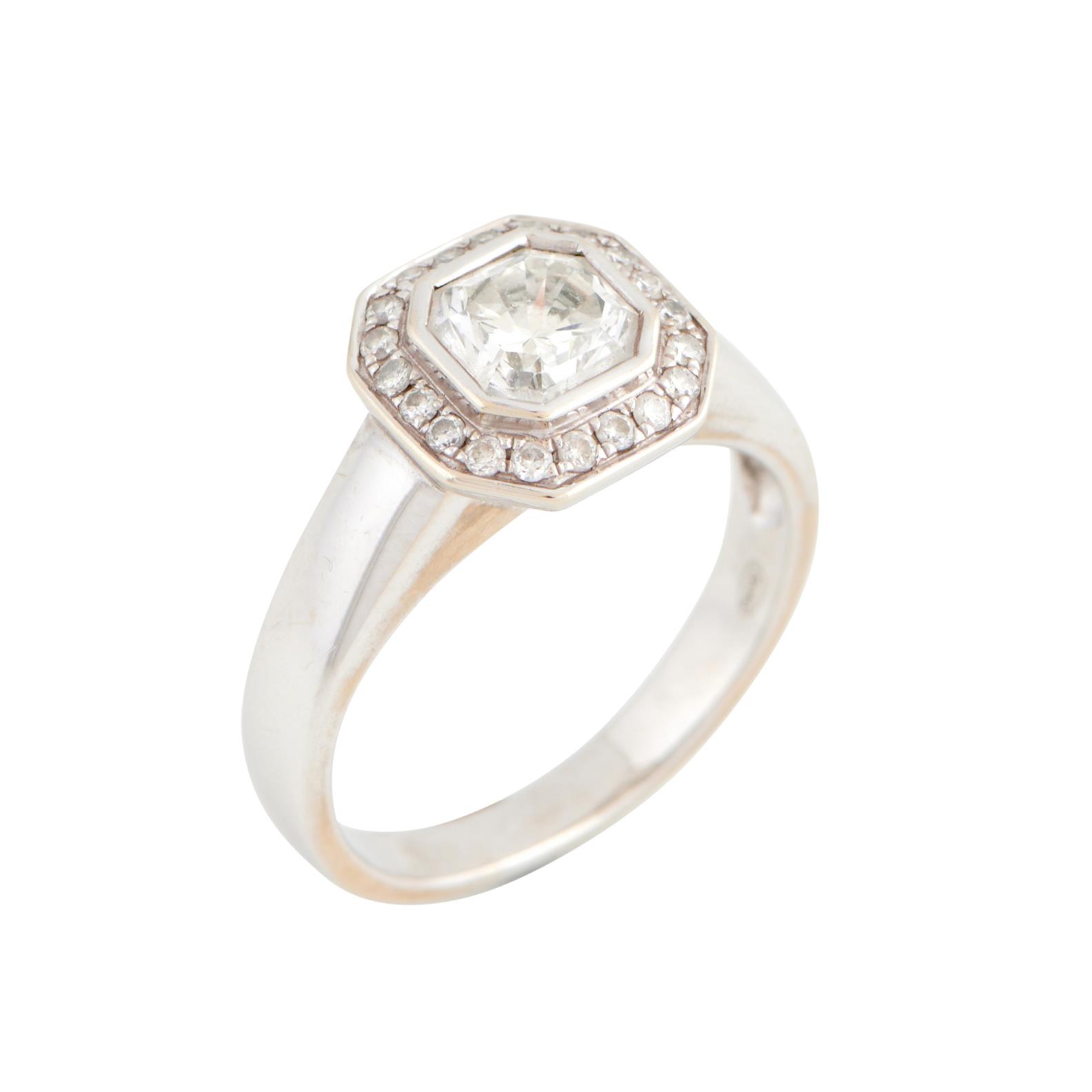Of cluster design, centring a lucere-cut diamond weighing 1.04 carats, within an octagonal surround of brilliant-cut diamonds together weighing approximately 0.16 carats, size L 1/2 .