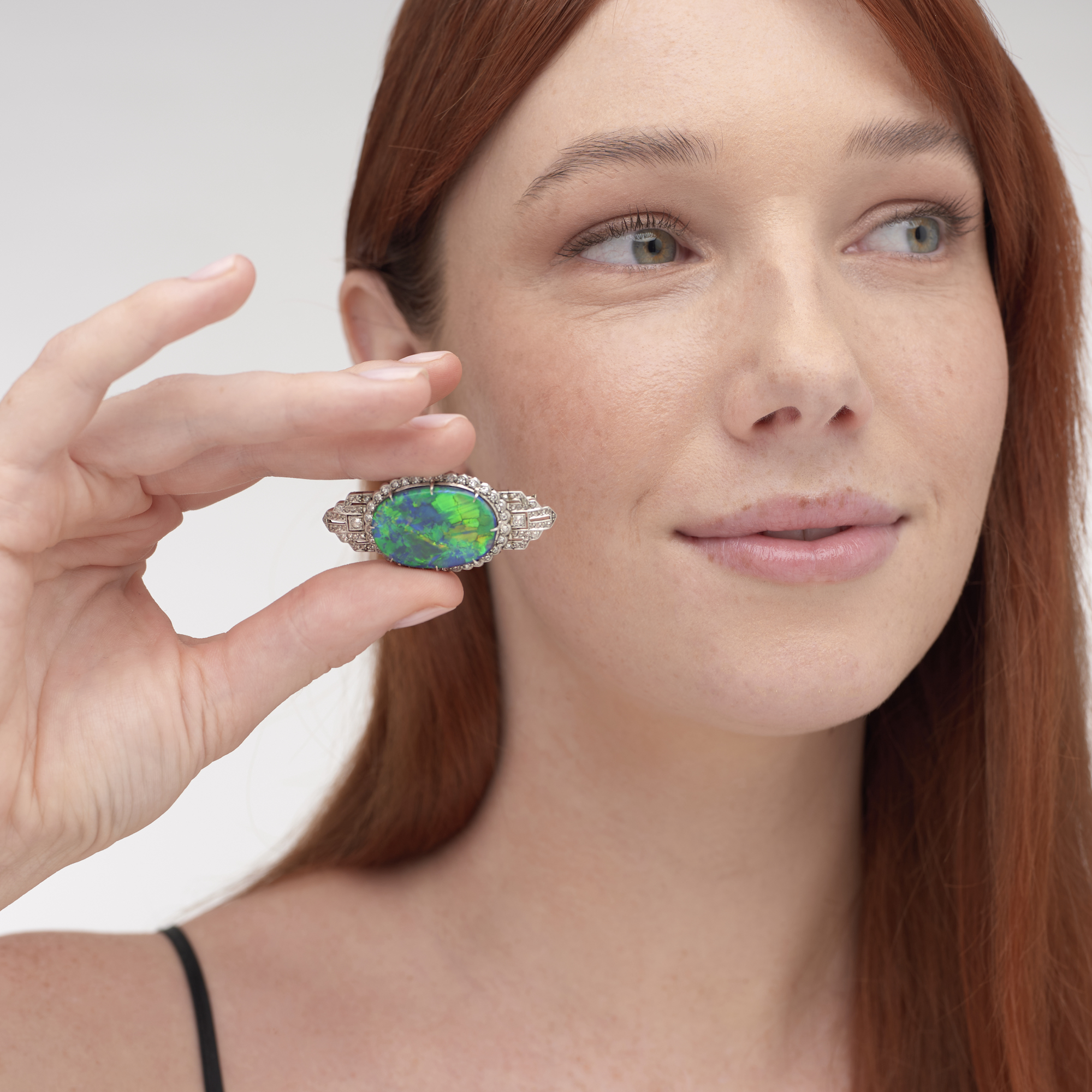 Centring a claw-set oval opal cut en cabochon weighing approximately 14.00 carats, within a geometric surround detailed with single, rose and old European-cut diamonds together weighing approximately 0.70 carats, length 22mm, width 50mm.