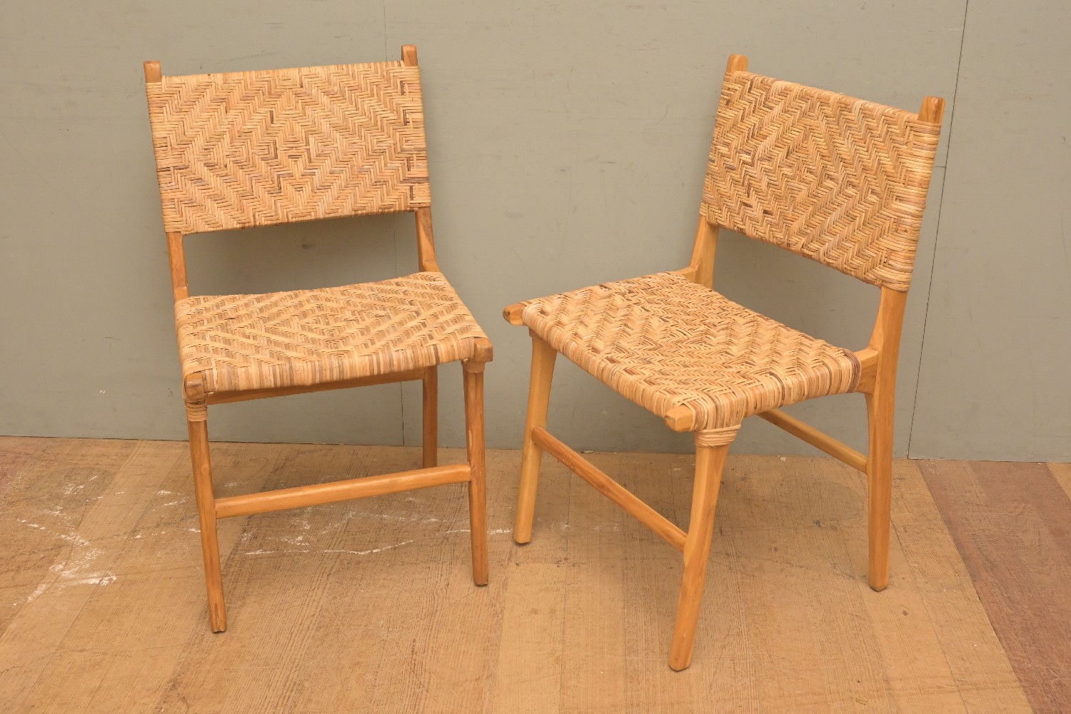 A PAIR OF MID-CENTURY STYLE TEAK AND RATTAN CHAIRS (89H X 51W X 54D CM) (LEONARD JOEL DELIVERY SIZE: LARGE)