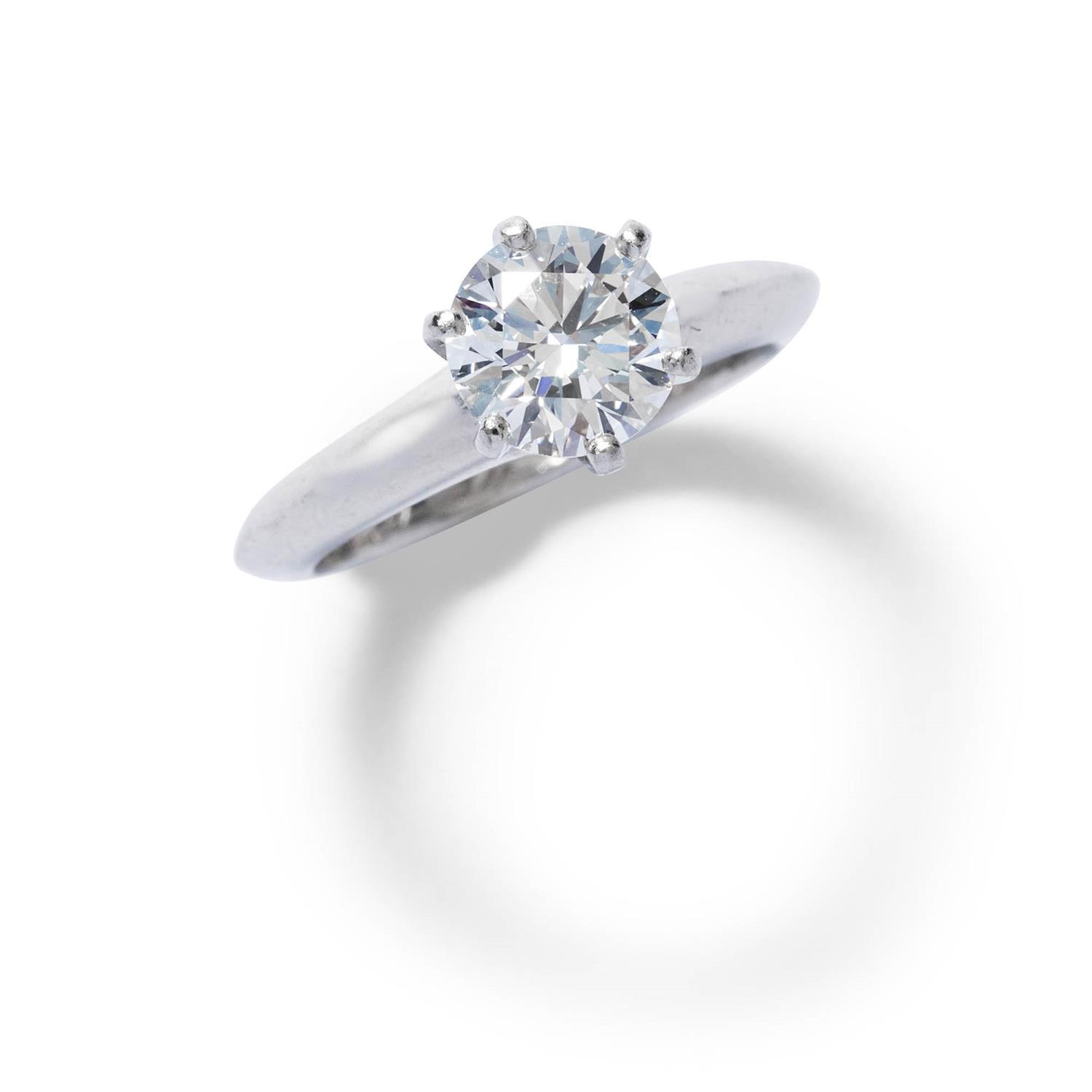 Claw-set with a round brilliant-cut diamond weighing 1.04 carats, mounted in platinum, size G1/2, signed Tiffany & Co.