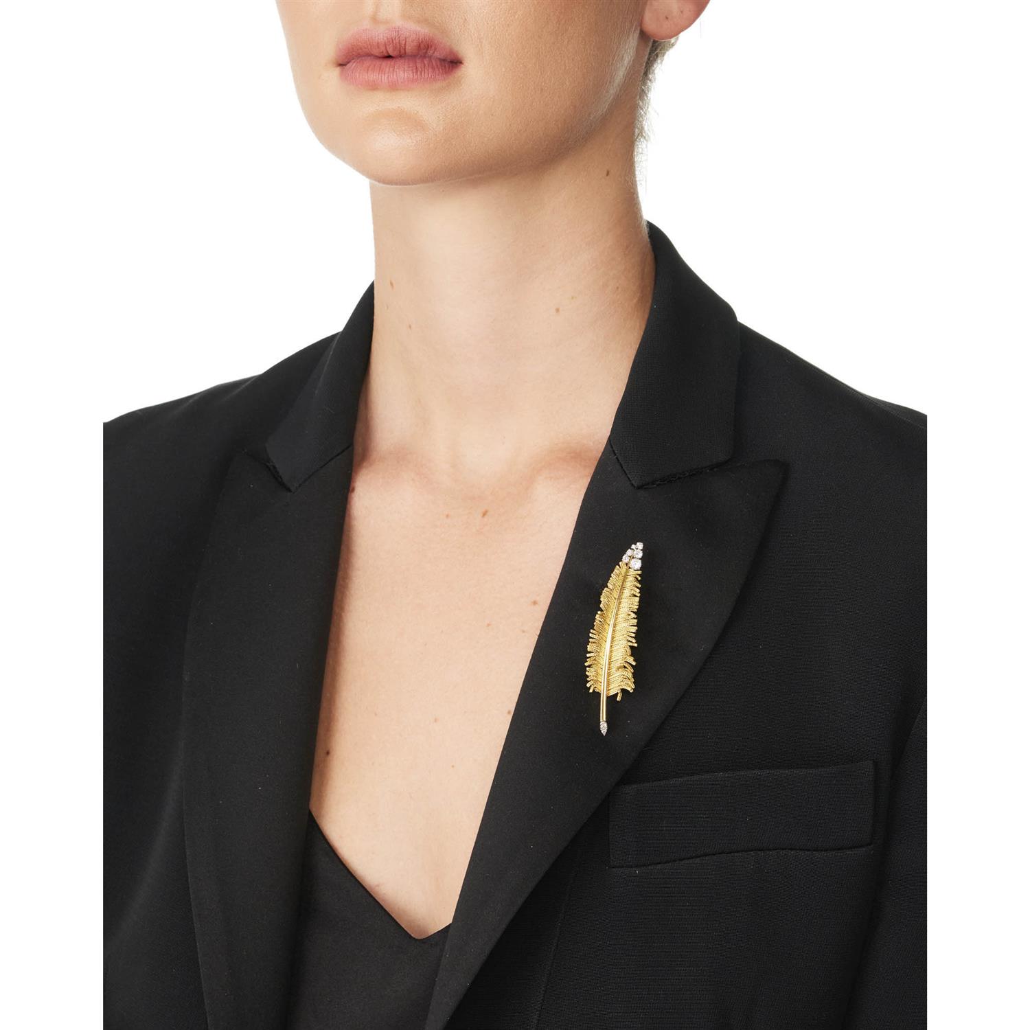 Designed as a feather, the vern composed of articulated lines of chain, the shaft decorated to the tip and base with brilliant-cut diamonds, the diamonds together weighing approximately 0.42 carats, length 69mm, French assay marks, numbered 2xxx2, signed Marchak Paris.
