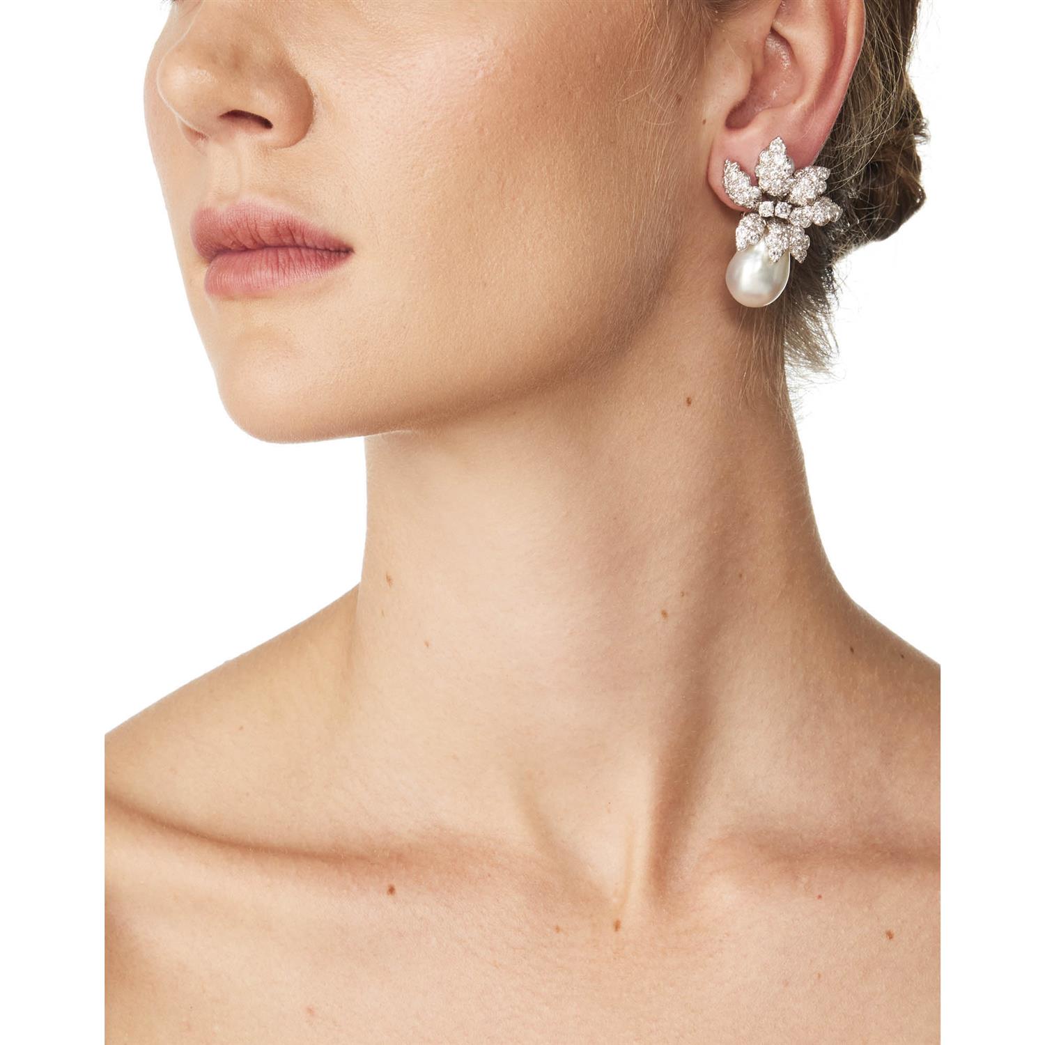 Each terminating on a baroque cultured pearl measuring approximately 20mm to 15mm, surmounted by an asymmetrical foliate cluster pavé-set with brilliant-cut diamonds, the diamonds together weighing approximately 4.50 - 5.50 carats, mounted in 18ct white gold and platinum, length 41mm, clip fittings, signed Webb for David Webb.