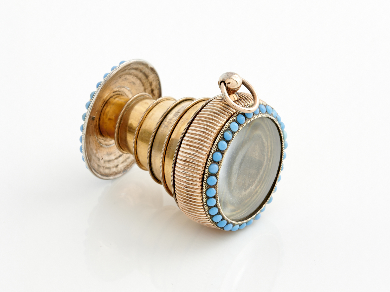 A GEORGIAN TURQUOISE SET FOB SPYGLASS IN GILDED SILVER, CIRCA 1820, DIAMETER 34MM