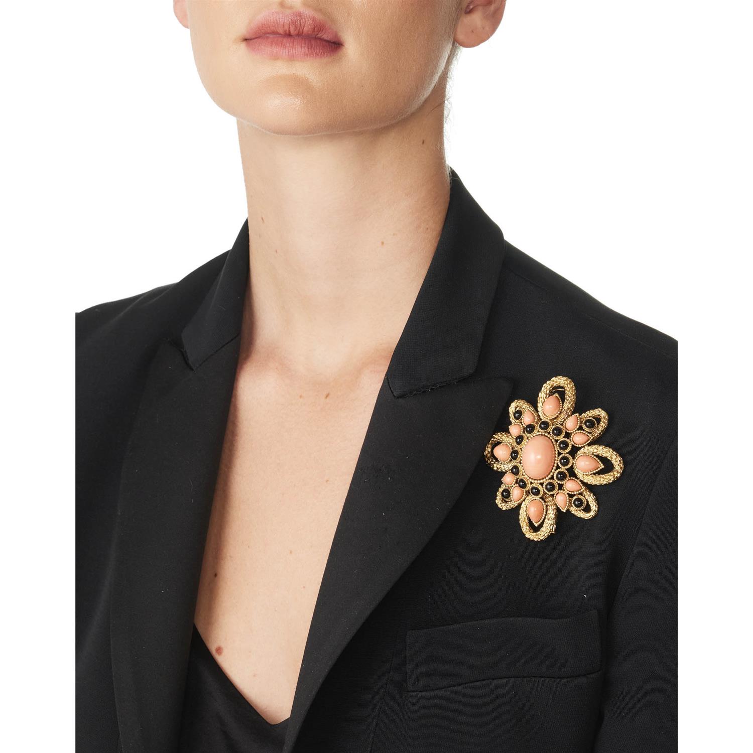 Centring an oval cabochon coral framed by a beaded surround further decorated by circular cabochon onyx and pear-shaped coral between openwork textured coiled serpentine motifs, length 78mm, width 72mm, numbered 2xxx6, signed Boucheron Paris.