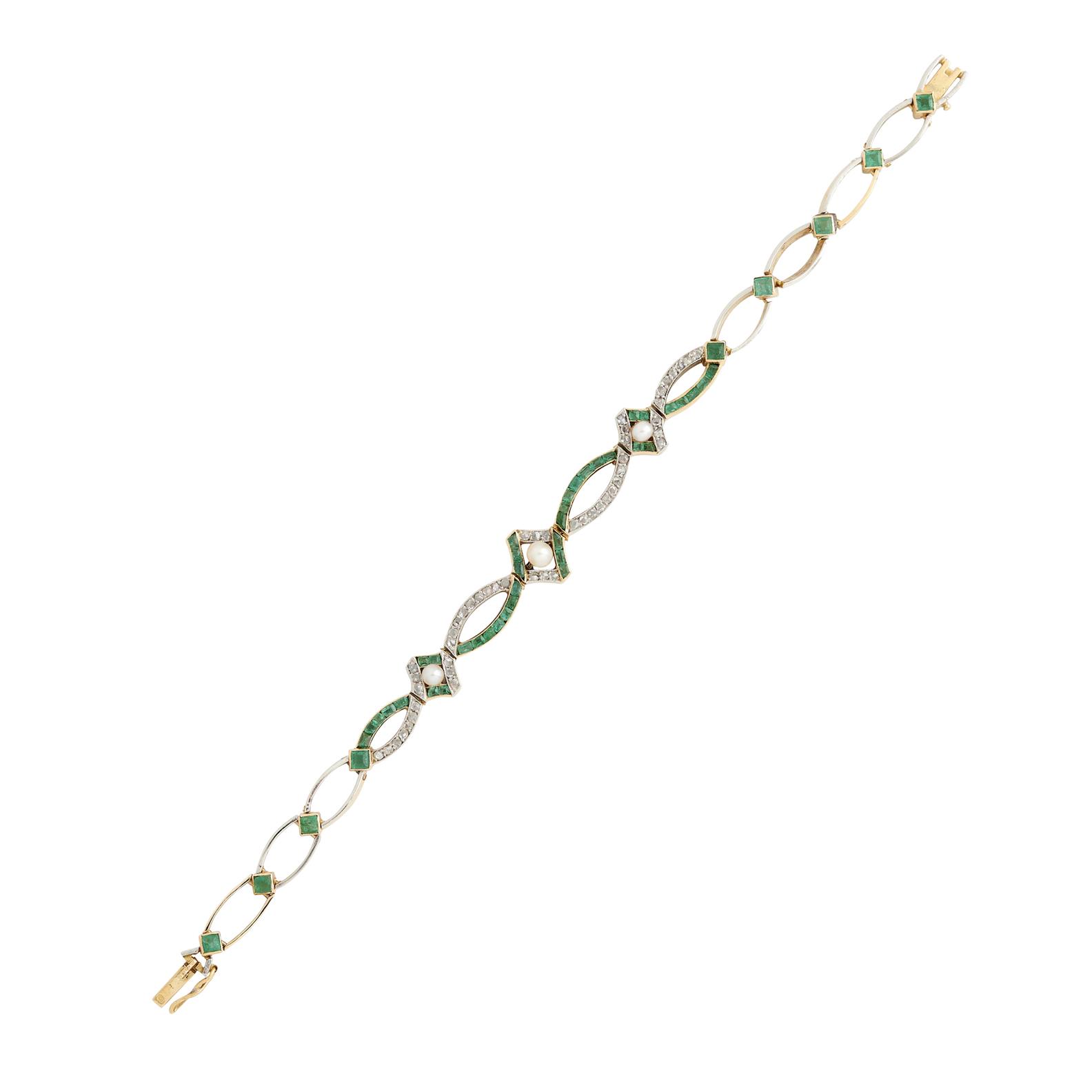 Comprising elliptical shaped links, decorated with calibre-cut emeralds and old European-cut diamonds, featuring three cultured pearls, completed by a tongue and groove clasp, length 165mm, gross weight 14.9 grams.